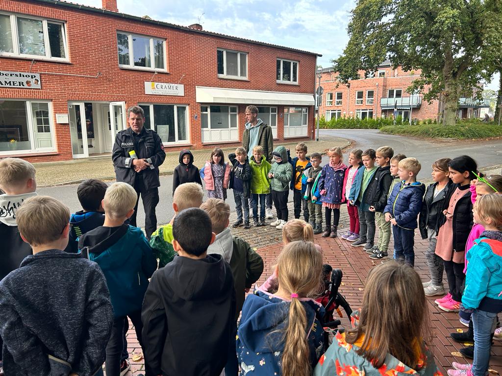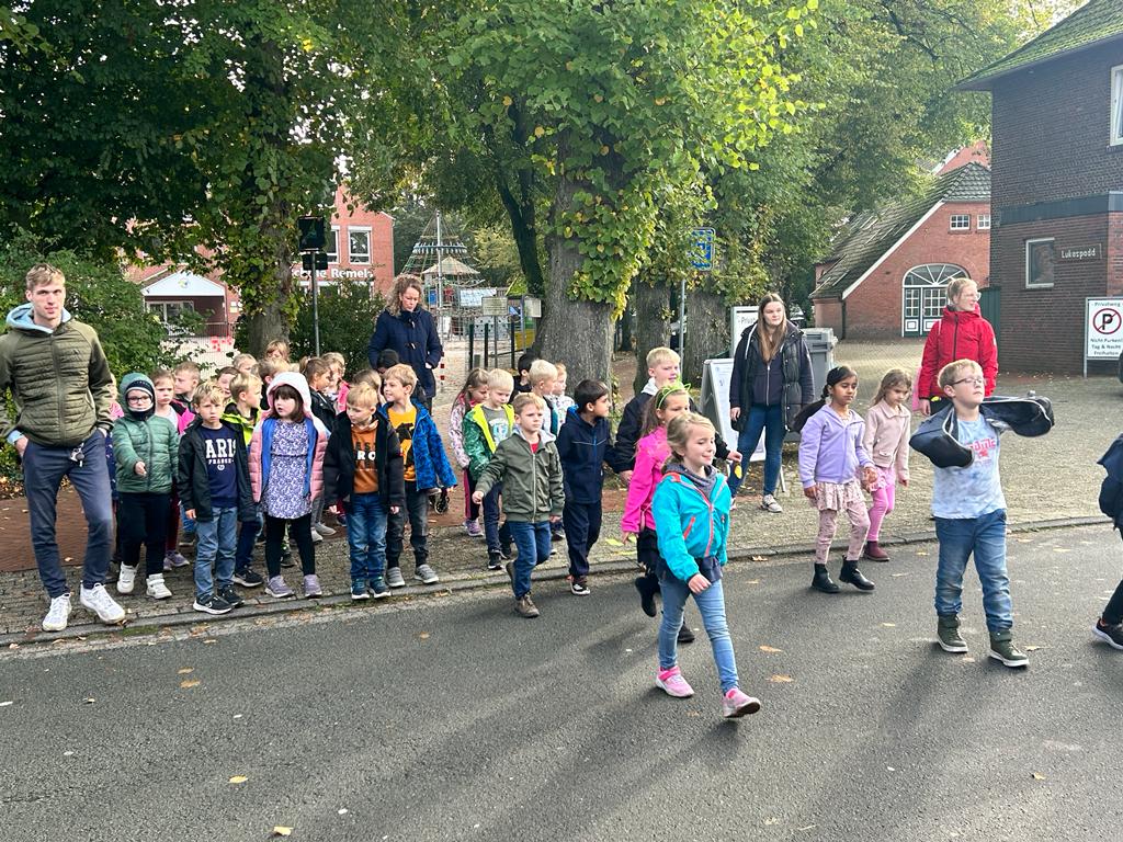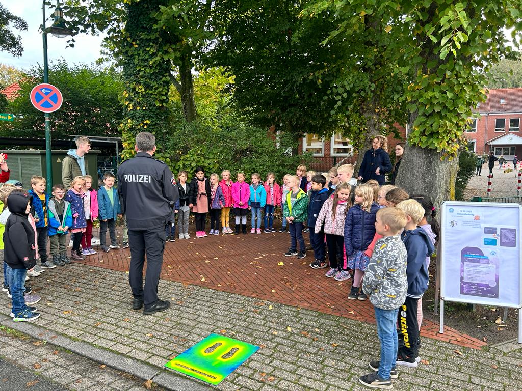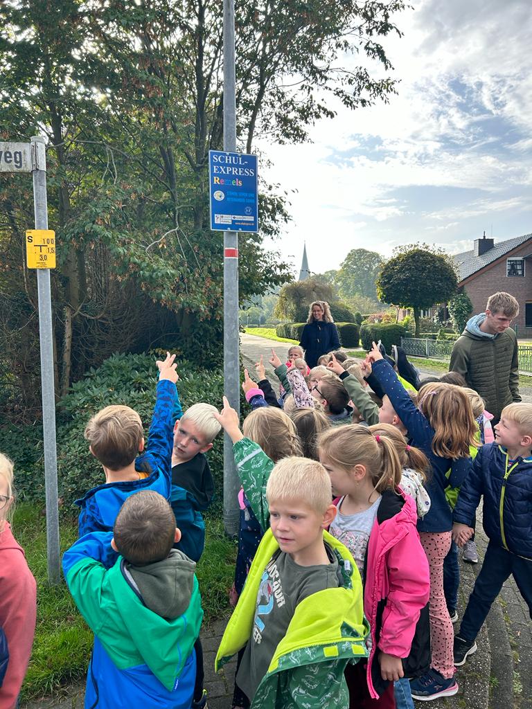 Wir sprachen darüber, welche Verkehrsmittel wir auf dem Weg zur Schule nutzen oder ob unsere eigenen Füße uns zur Schule tragen. Wir tauschten uns über unsere Schulwege aus und ergründeten die Vor-und Nachteile der genutzten Verkehrsmittel. Wir haben an mehreren Straßen in der Nähe der Schule geübt, wie wir sicher die Straße überqueren können. Gemeinsam mit dem Polizisten Herrn Franzen haben wir geprüft, an welchen Stellen wir die Straße gut einsehen und so sicherer überqueren können. Hier wurden gelbe Füße aufgesprüht. Außerdem überprüften die Polizisten alle Fahrräder auf Verkehrssicherheit, damit wir sicher mit dem Fahrrad zur Schule kommen. Zum Schluss machten wir noch einen tollen Spaziergang zu einer Schulexpress-Haltestelle und anschließend zum nahegelegenen Spielplatz. Wir haben ausgelassen zusammen gespielt! Das war ein schöner Tag!