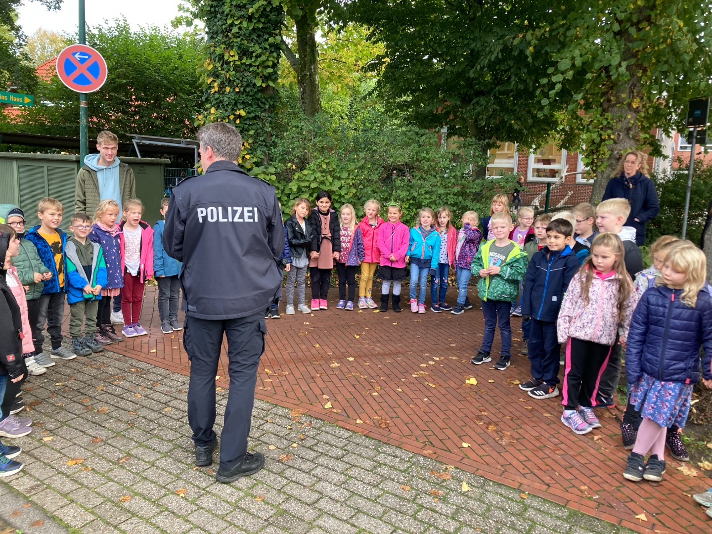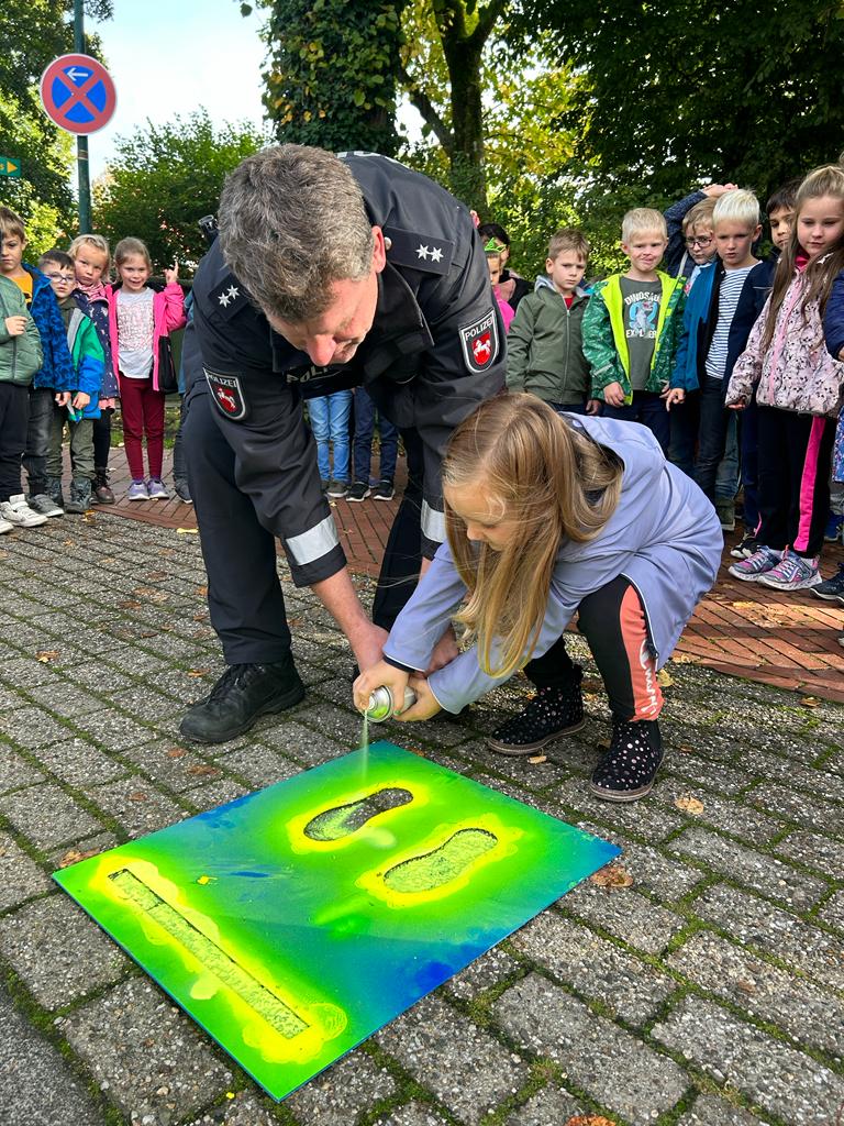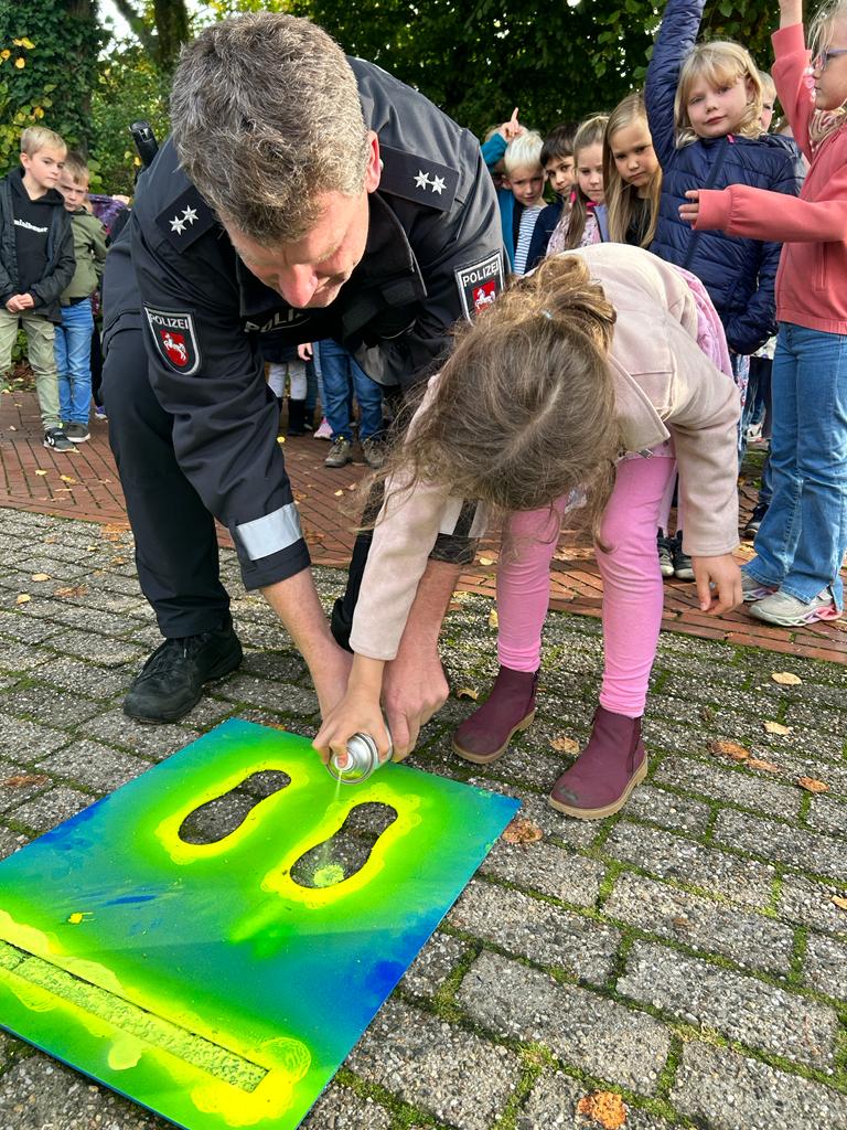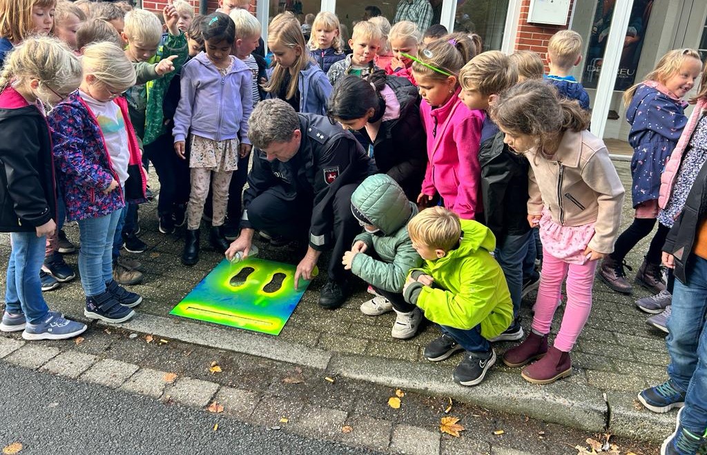 Wir sprachen darüber, welche Verkehrsmittel wir auf dem Weg zur Schule nutzen oder ob unsere eigenen Füße uns zur Schule tragen. Wir tauschten uns über unsere Schulwege aus und ergründeten die Vor-und Nachteile der genutzten Verkehrsmittel. Wir haben an mehreren Straßen in der Nähe der Schule geübt, wie wir sicher die Straße überqueren können. Gemeinsam mit dem Polizisten Herrn Franzen haben wir geprüft, an welchen Stellen wir die Straße gut einsehen und so sicherer überqueren können. Hier wurden gelbe Füße aufgesprüht. Außerdem überprüften die Polizisten alle Fahrräder auf Verkehrssicherheit, damit wir sicher mit dem Fahrrad zur Schule kommen. Zum Schluss machten wir noch einen tollen Spaziergang zu einer Schulexpress-Haltestelle und anschließend zum nahegelegenen Spielplatz. Wir haben ausgelassen zusammen gespielt! Das war ein schöner Tag!