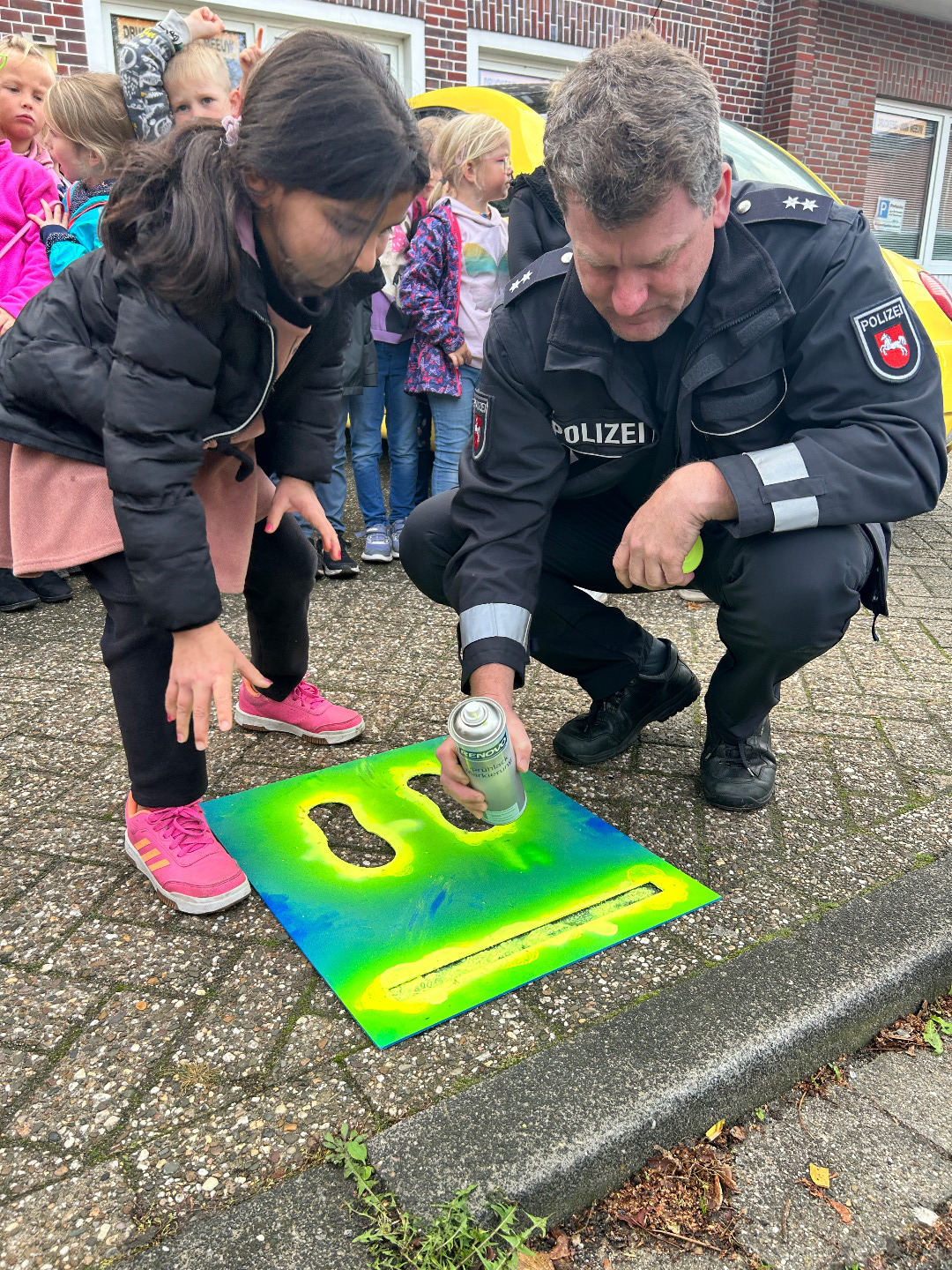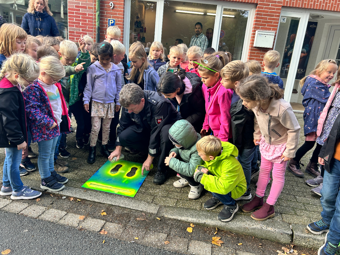 Wir sprachen darüber, welche Verkehrsmittel wir auf dem Weg zur Schule nutzen oder ob unsere eigenen Füße uns zur Schule tragen. Wir tauschten uns über unsere Schulwege aus und ergründeten die Vor-und Nachteile der genutzten Verkehrsmittel. Wir haben an mehreren Straßen in der Nähe der Schule geübt, wie wir sicher die Straße überqueren können. Gemeinsam mit dem Polizisten Herrn Franzen haben wir geprüft, an welchen Stellen wir die Straße gut einsehen und so sicherer überqueren können. Hier wurden gelbe Füße aufgesprüht. Außerdem überprüften die Polizisten alle Fahrräder auf Verkehrssicherheit, damit wir sicher mit dem Fahrrad zur Schule kommen. Zum Schluss machten wir noch einen tollen Spaziergang zu einer Schulexpress-Haltestelle und anschließend zum nahegelegenen Spielplatz. Wir haben ausgelassen zusammen gespielt! Das war ein schöner Tag!