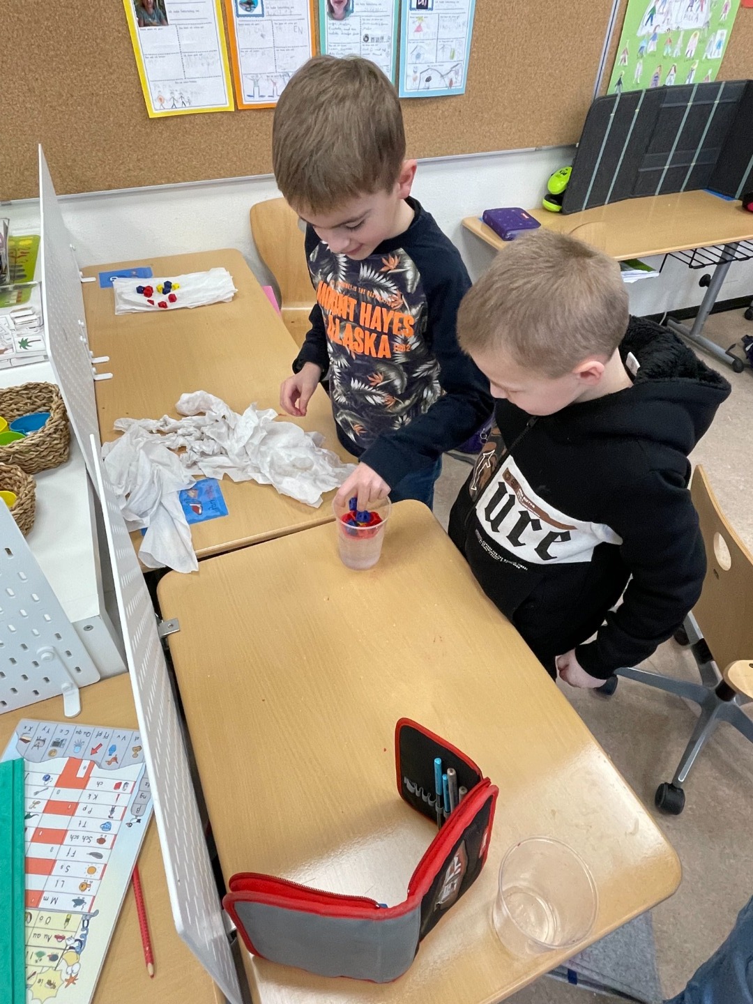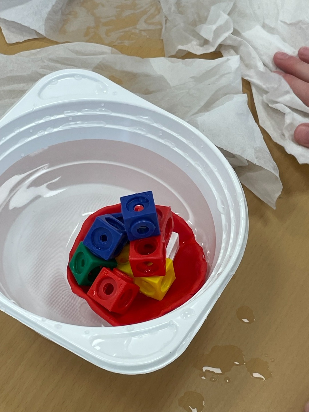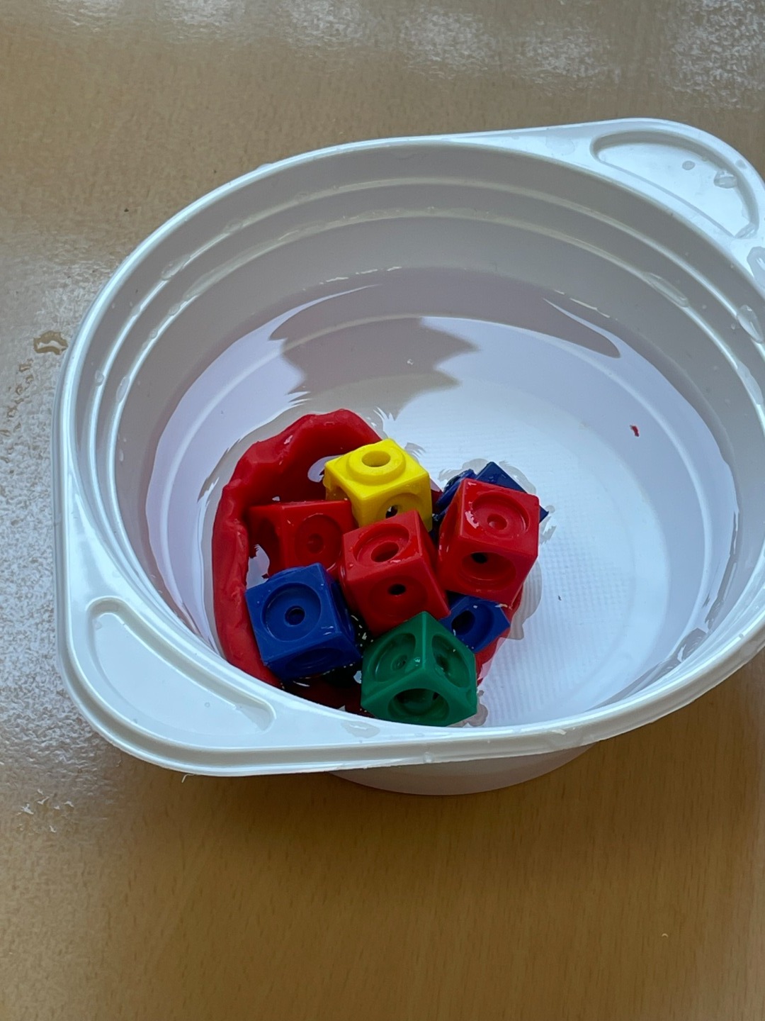 In den letzten Woche haben wir im Sachunterricht untersucht, welche Dinge schwimmen und welche Dinge sinken. Dabei haben wir zum Beispiel herausgefunden, dass Dinge aus Holz meistens schwimmen und Steine immer untergehen. Auch eine Kugel aus Knete geht unter. Wir haben aber herausgefunden, dass Knete in einer anderen Form schwimmen kann und sogar richtig viele Steckwürfel auf einem kleinen Knetschiff transportiert werden können. Das könnt ihr euch auf den Fotos anschauen.
