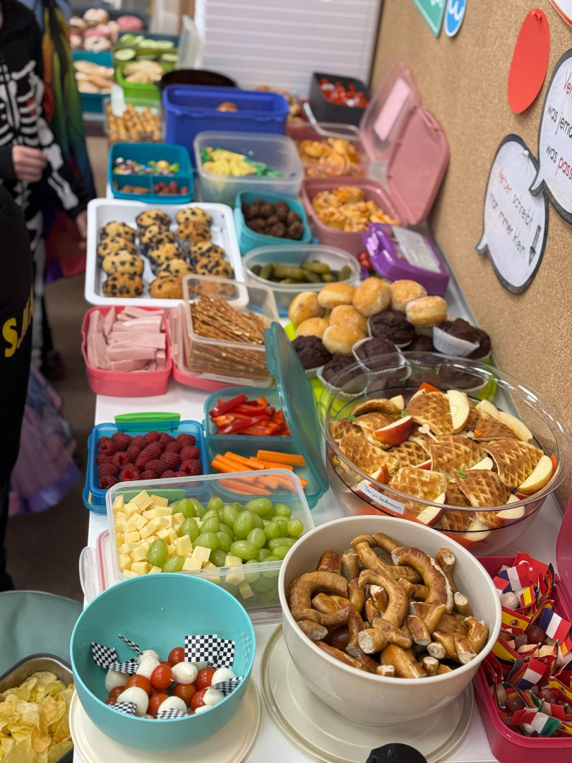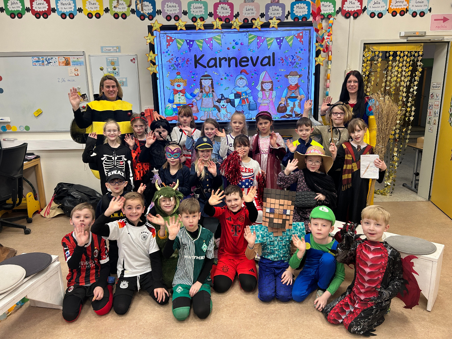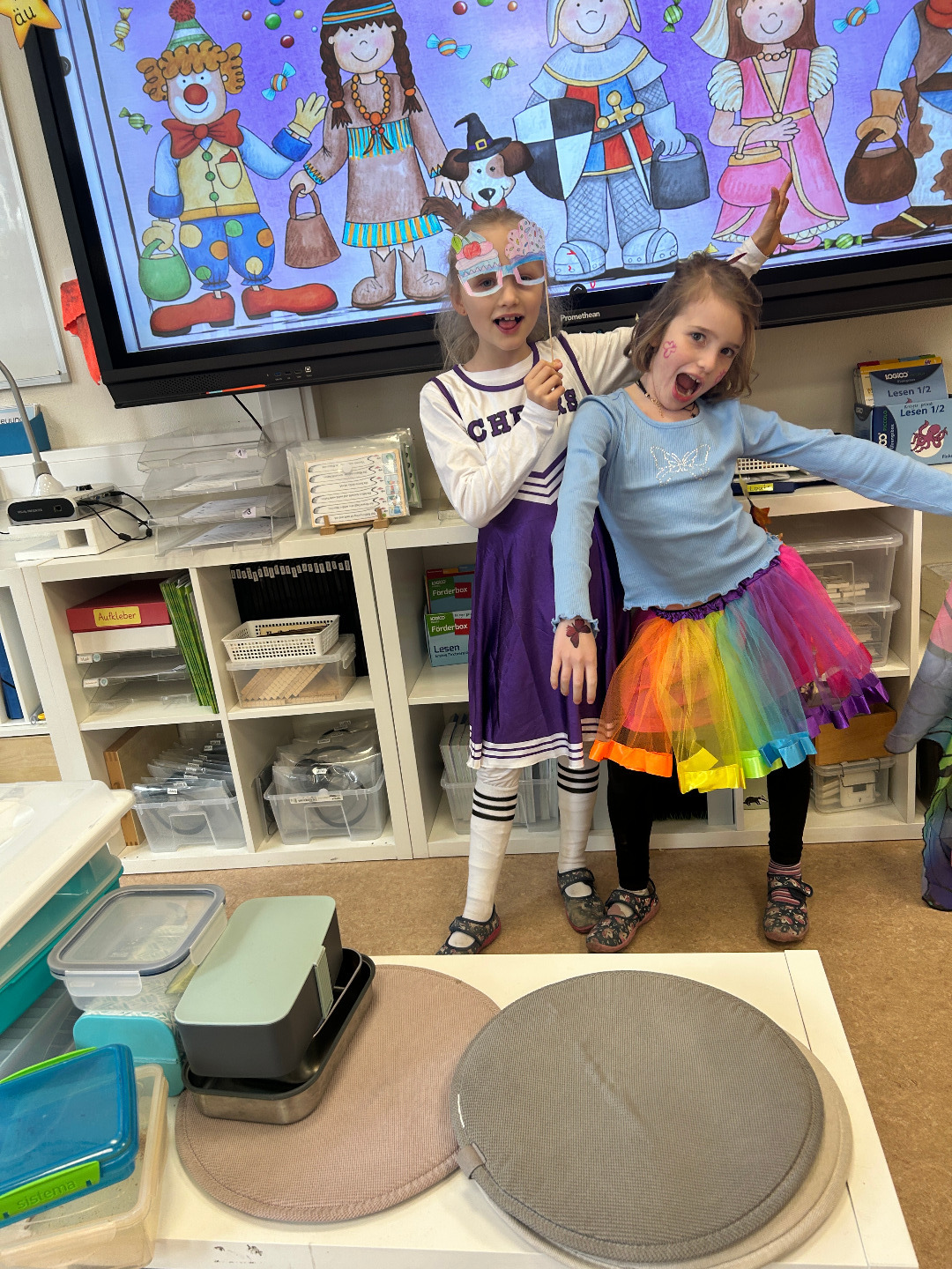 Heute ging es bunt und lustig in unserer Klasse zu! Viele lustige Gestalten liefen herum und feierten ausgelassen zusammen. In unsererm Klassenraum tanzten Cheerleaderinnen, eine Polizistin, zahlreiche Fußballer, ein Feuerwehrmann, viele bunte Schmetterlinge, eine Dame von Welt, ein Marienkäfer, Wednesday, ein Skelett, Hermine Granger, ein Drache, Luigi, Steve, eine Prinzessin, ein FBI-Agent, eine Biene und sogar Schneewittchen herum! Es wurde außerdem gesungen, gebastelt, viiiiiel gegessen und gespielt! Das war ein toller Tag und wir freuen uns schon jetzt aufs nächste Jahr!
