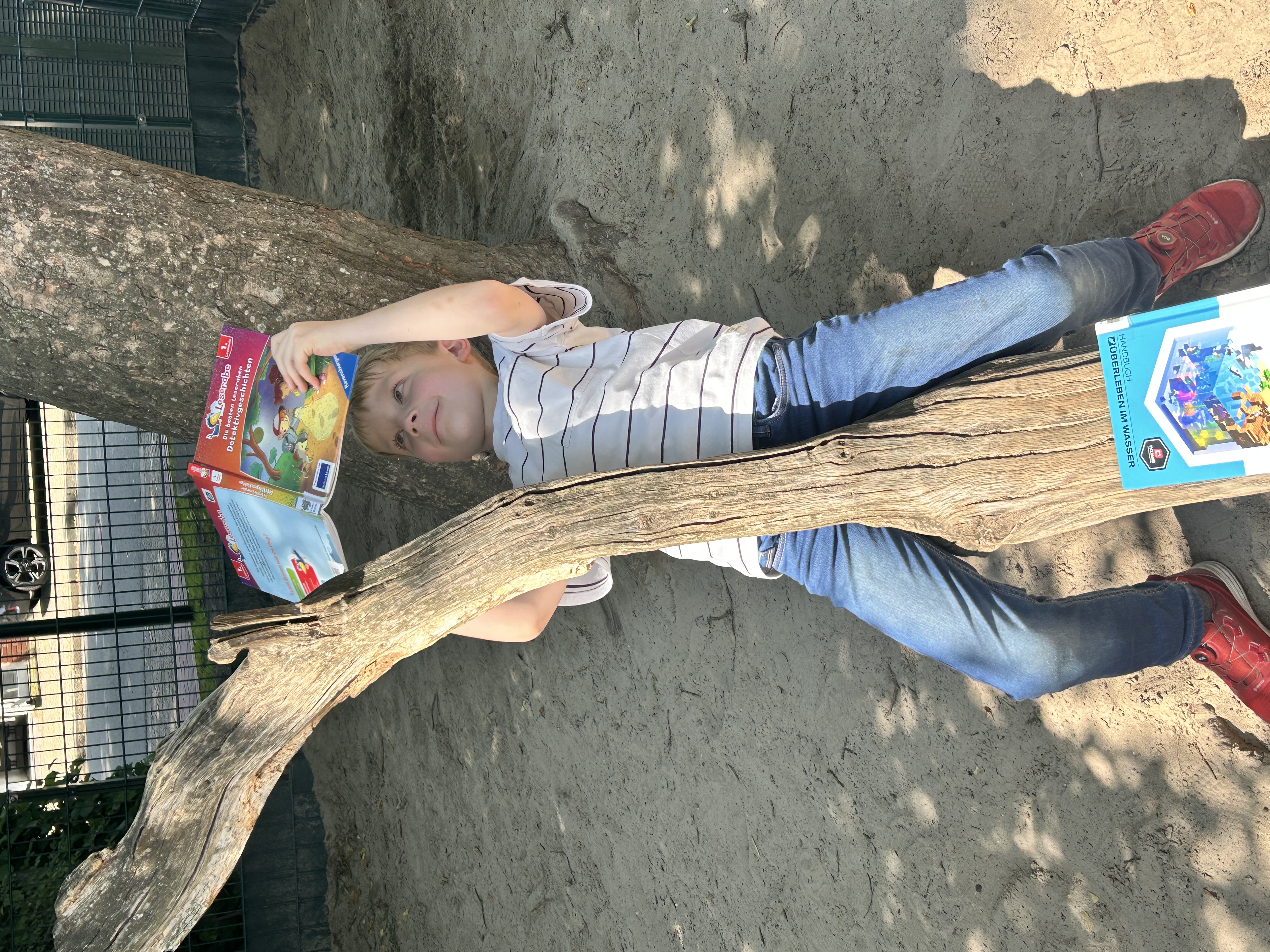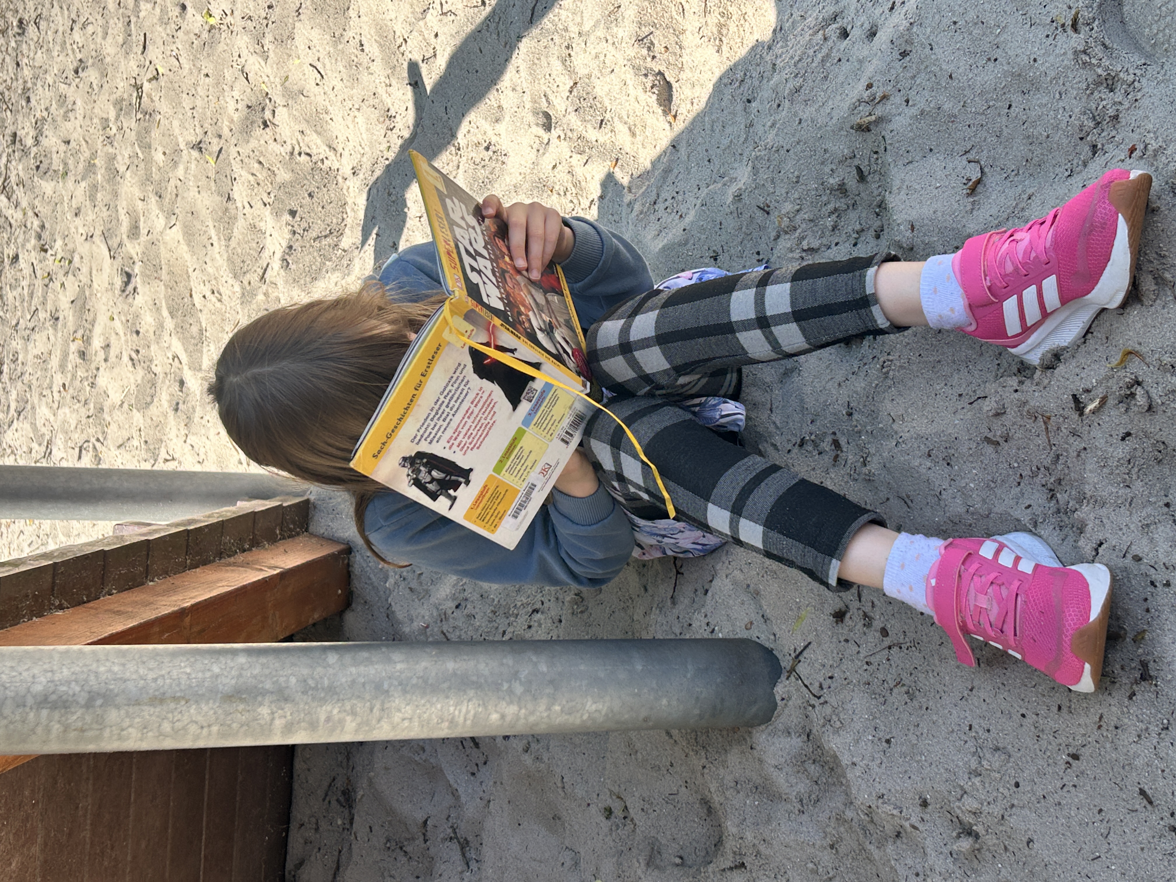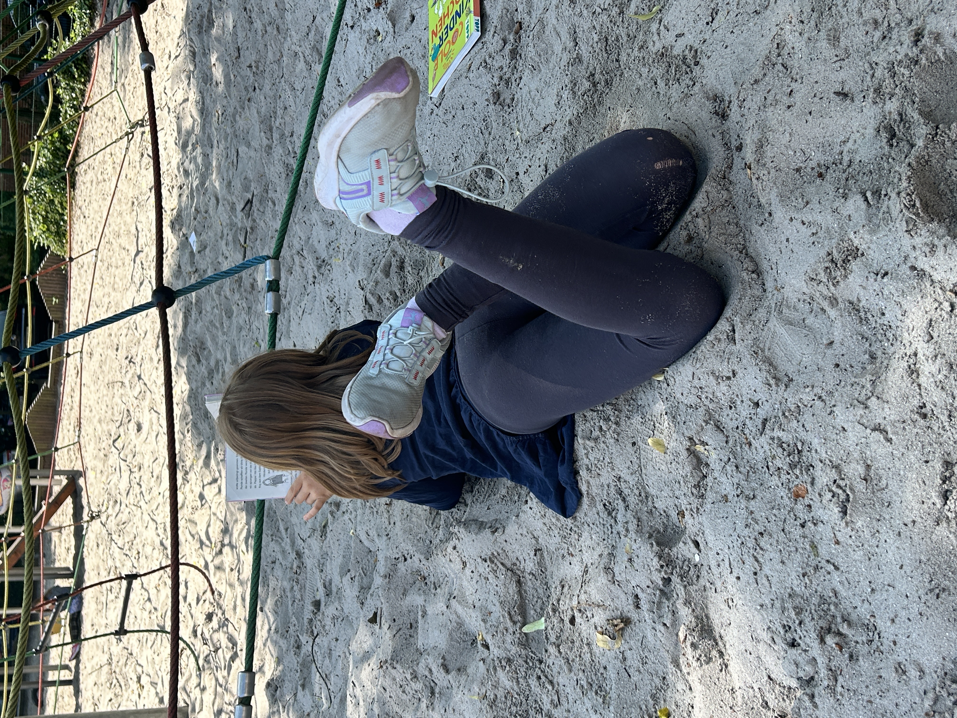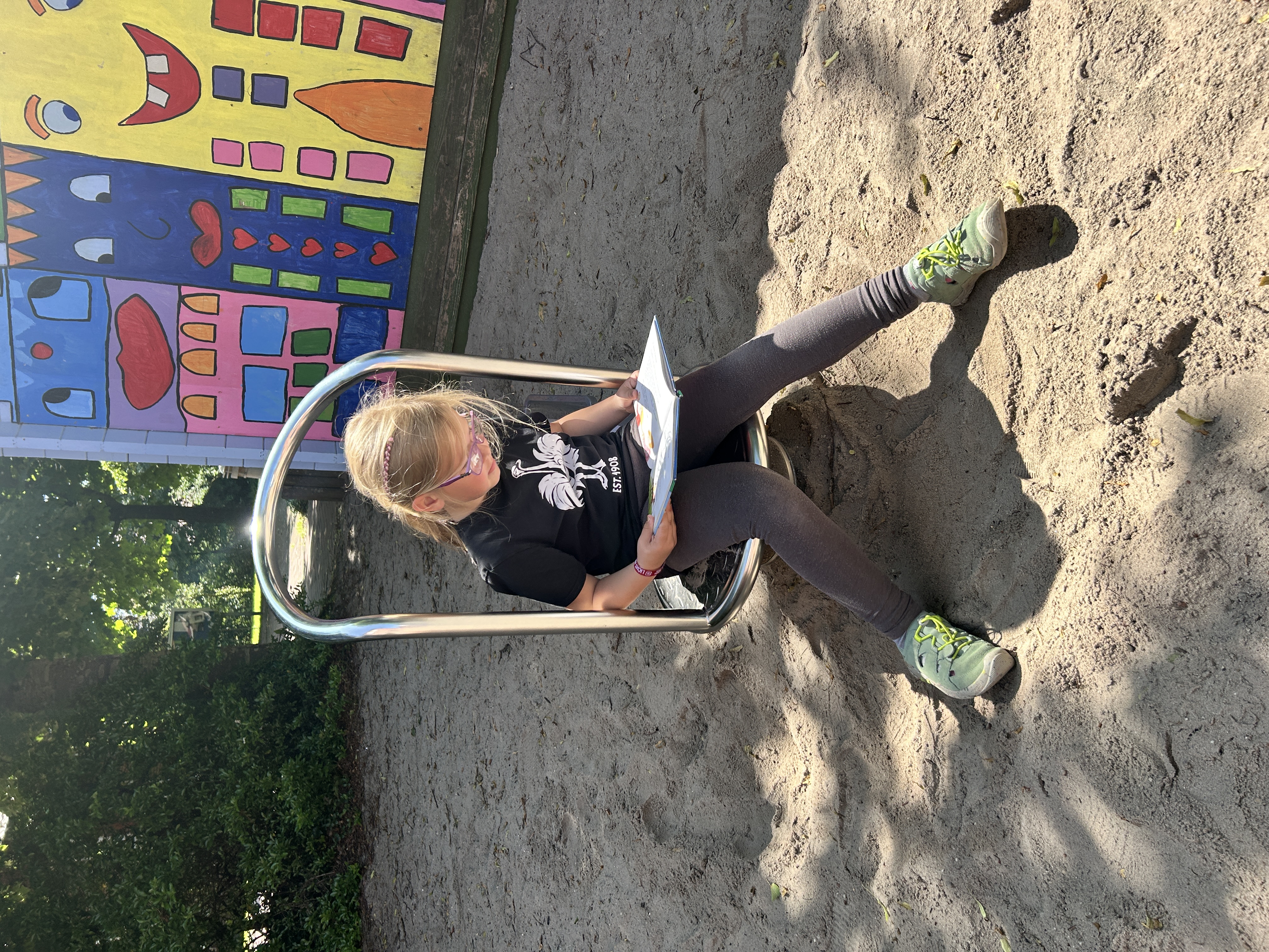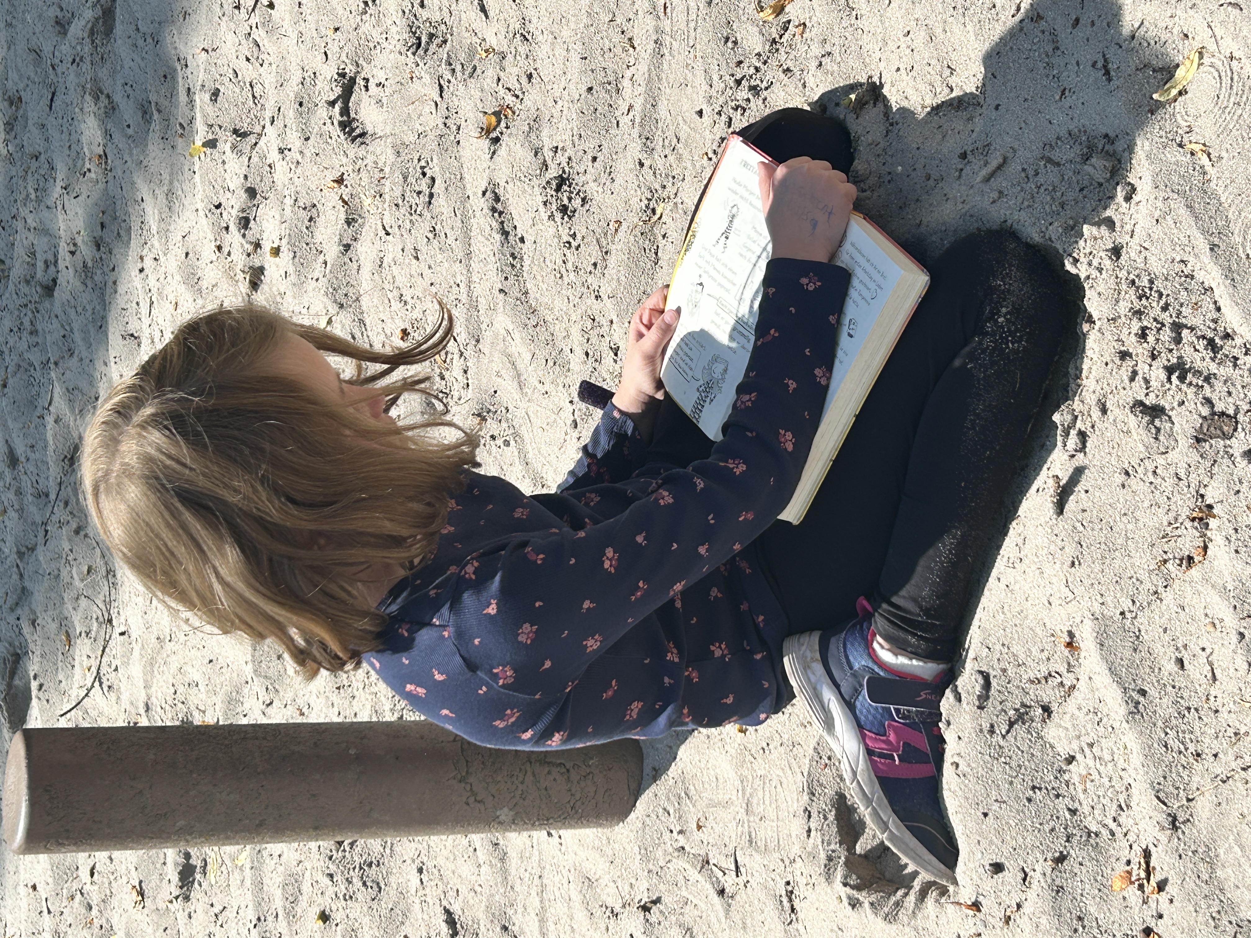 Heute fand unsere Lesezeit mal draußen statt. Nach langem Regen scheint nun endlich wieder die Sonne! Jeder von uns hat sich einen schönen Ort auf dem Schulhof gesucht und dort gelesen. Lesen in der Sonne, im Sand, auf der Kletterpyramide, in der Blätterhöhle oder auf dem Spielturm macht Spaß!