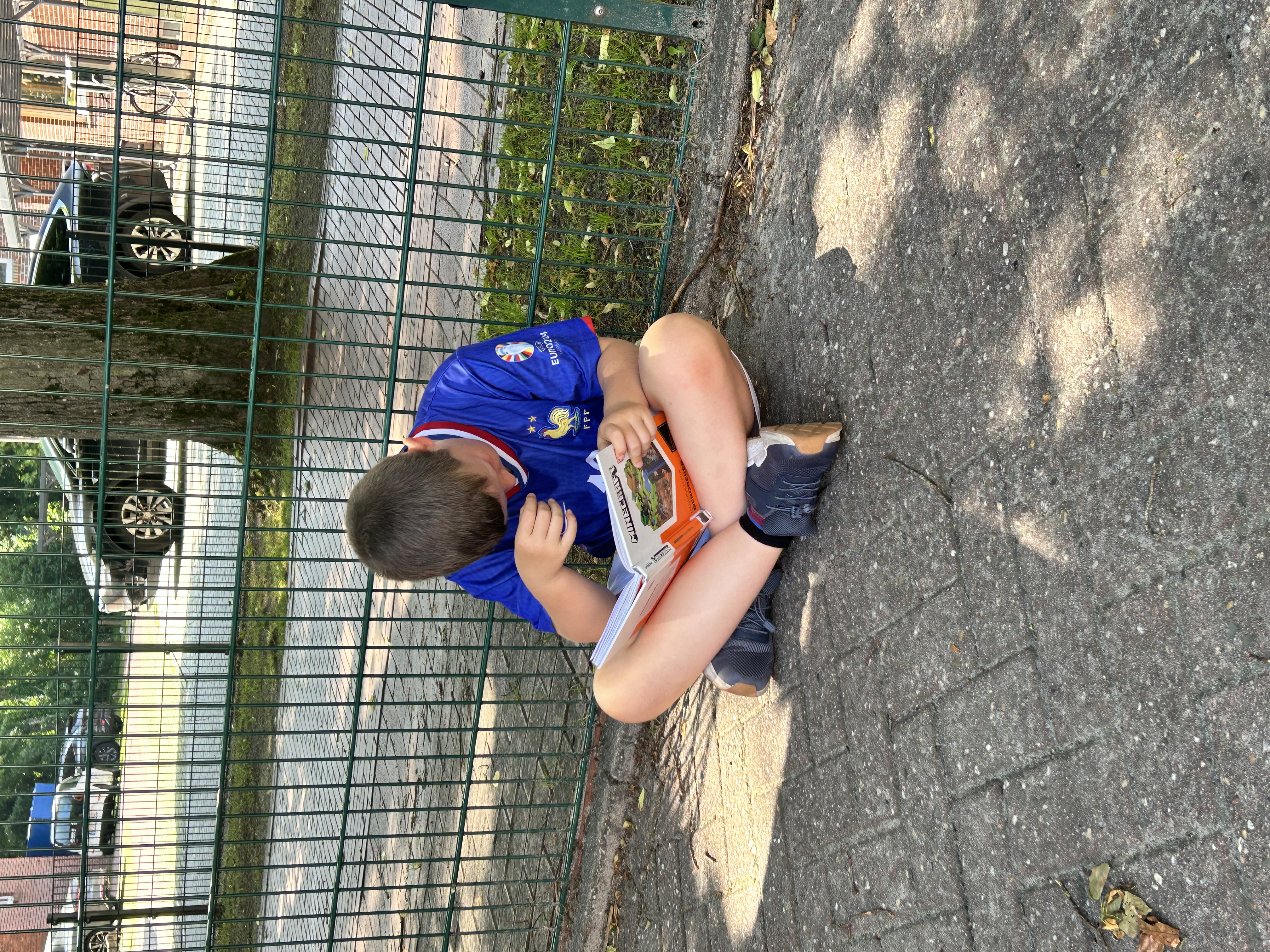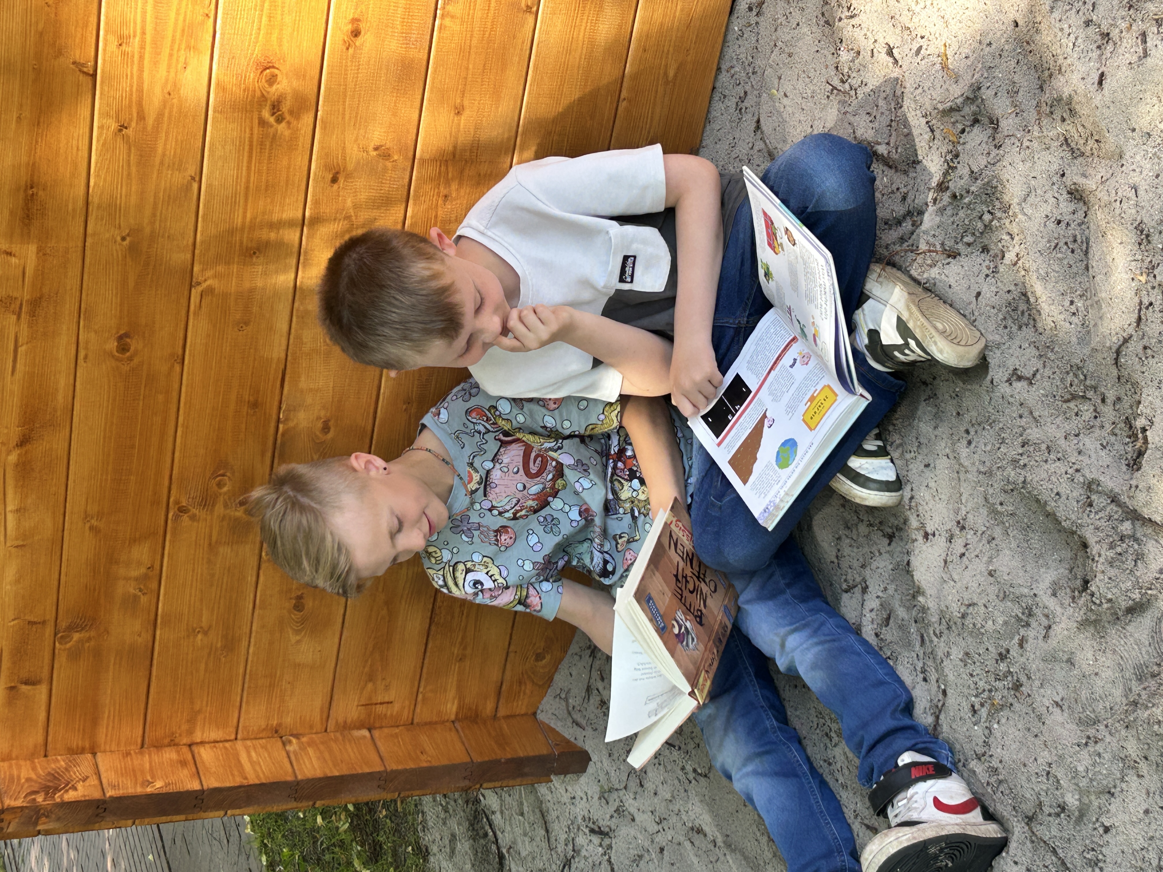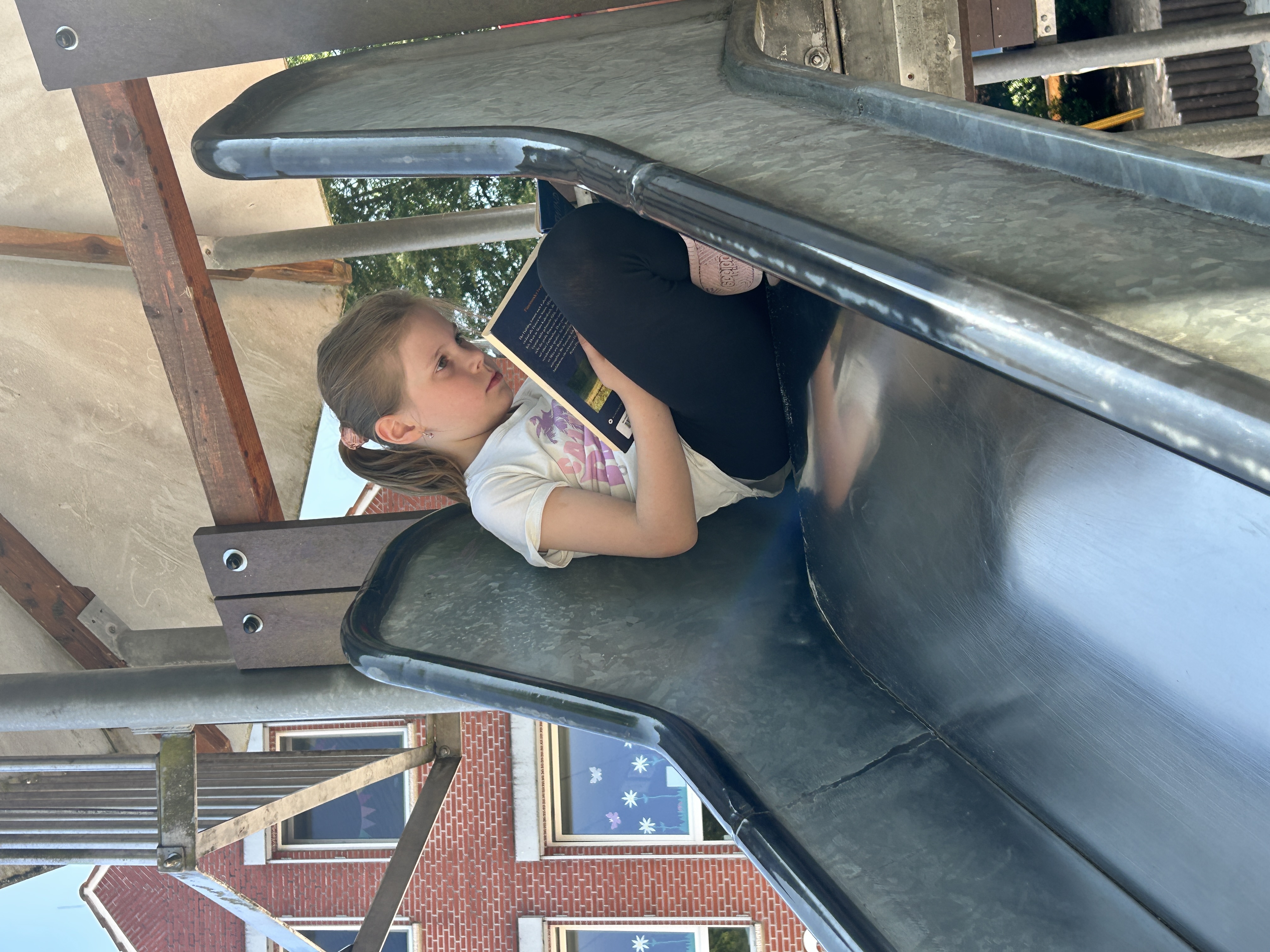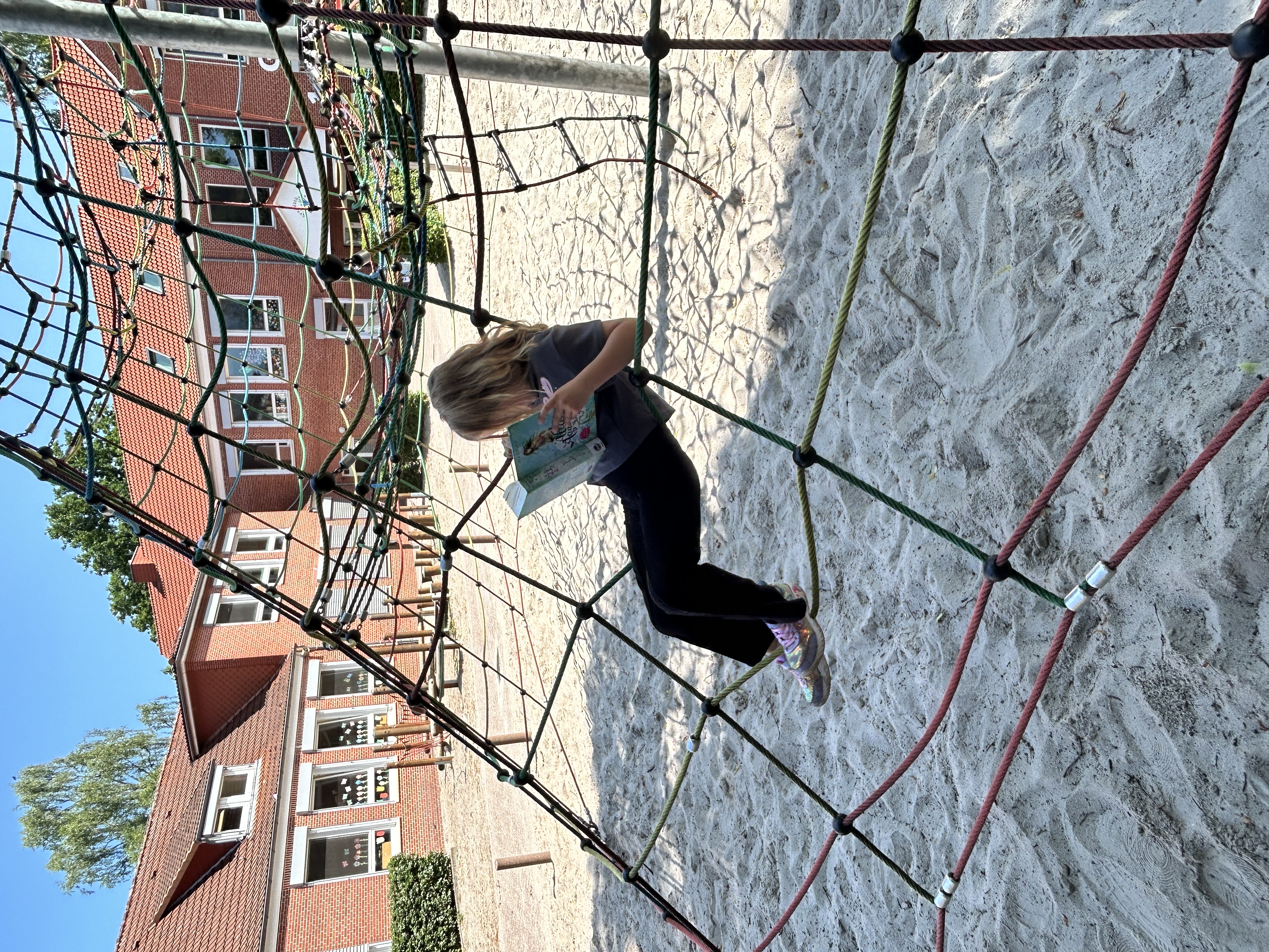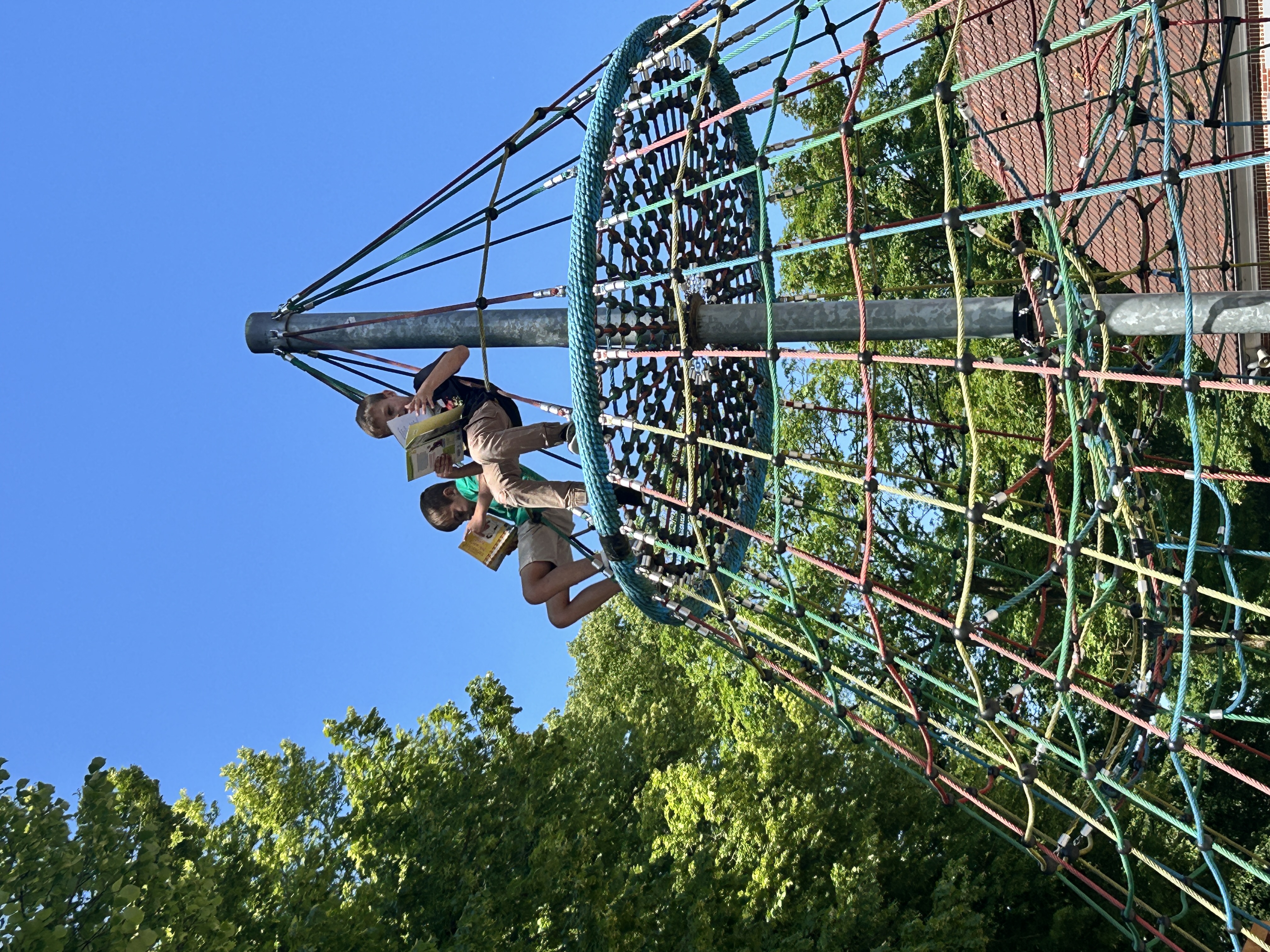 Heute fand unsere Lesezeit mal draußen statt. Nach langem Regen scheint nun endlich wieder die Sonne! Jeder von uns hat sich einen schönen Ort auf dem Schulhof gesucht und dort gelesen. Lesen in der Sonne, im Sand, auf der Kletterpyramide, in der Blätterhöhle oder auf dem Spielturm macht Spaß!