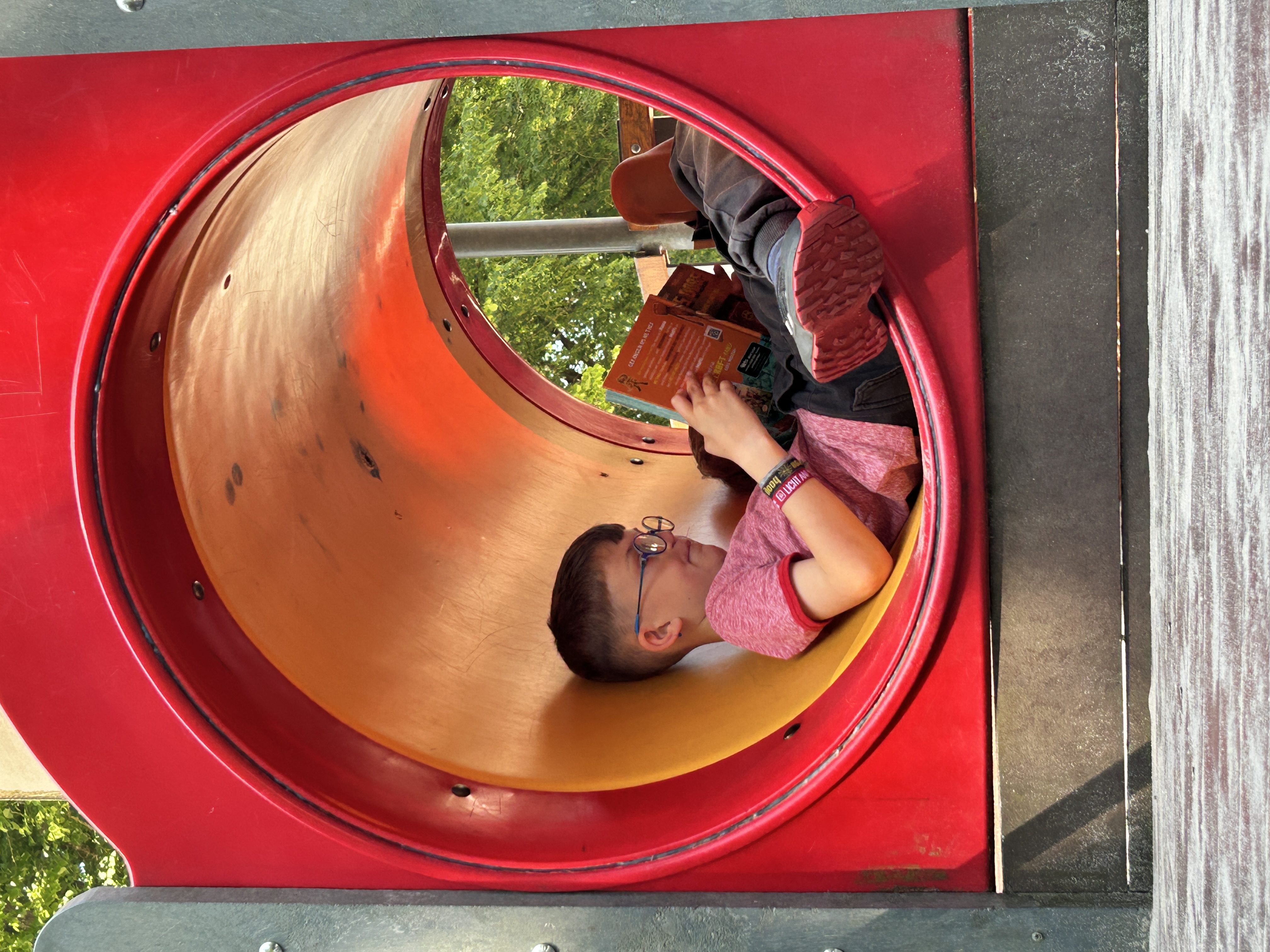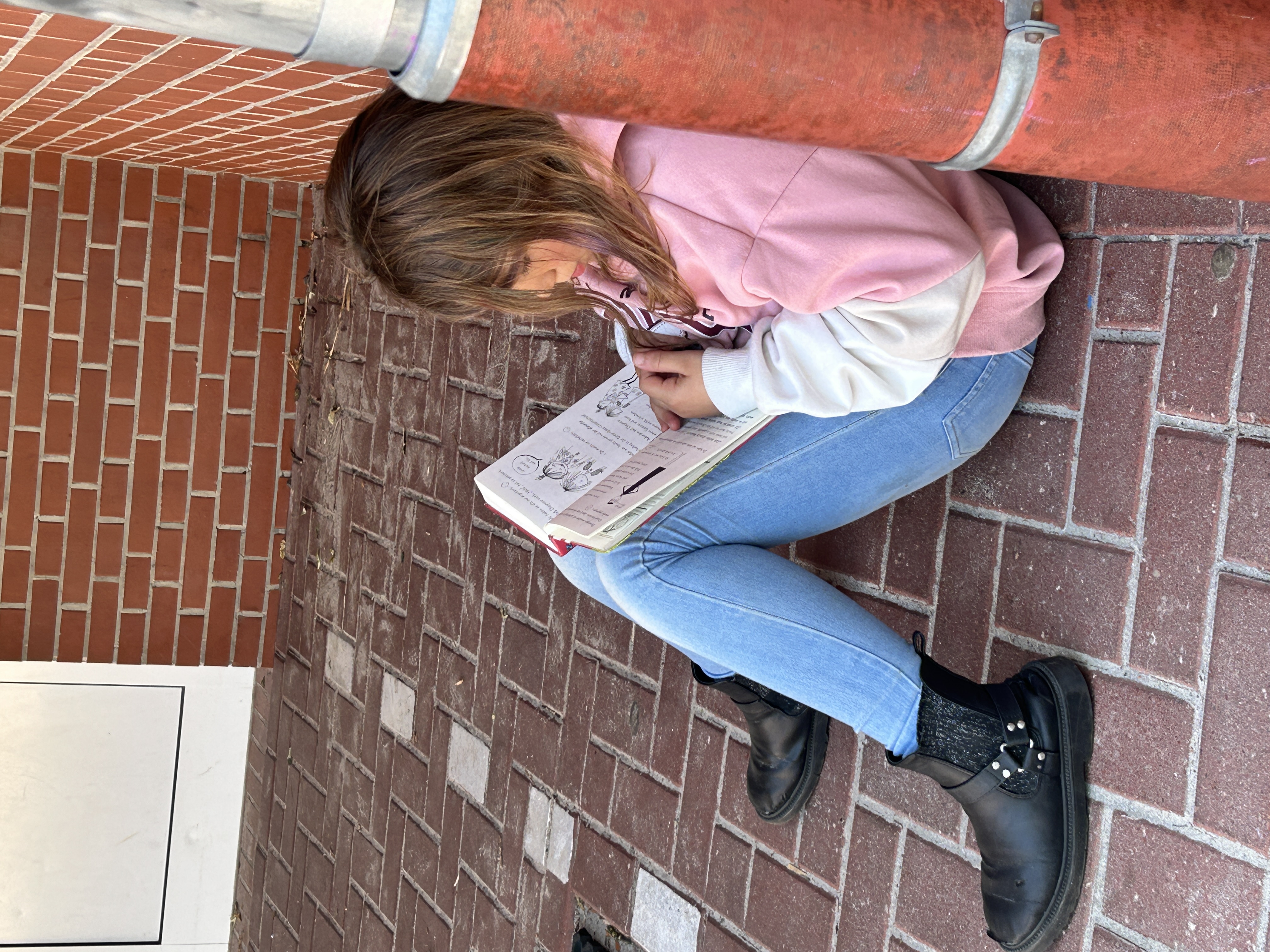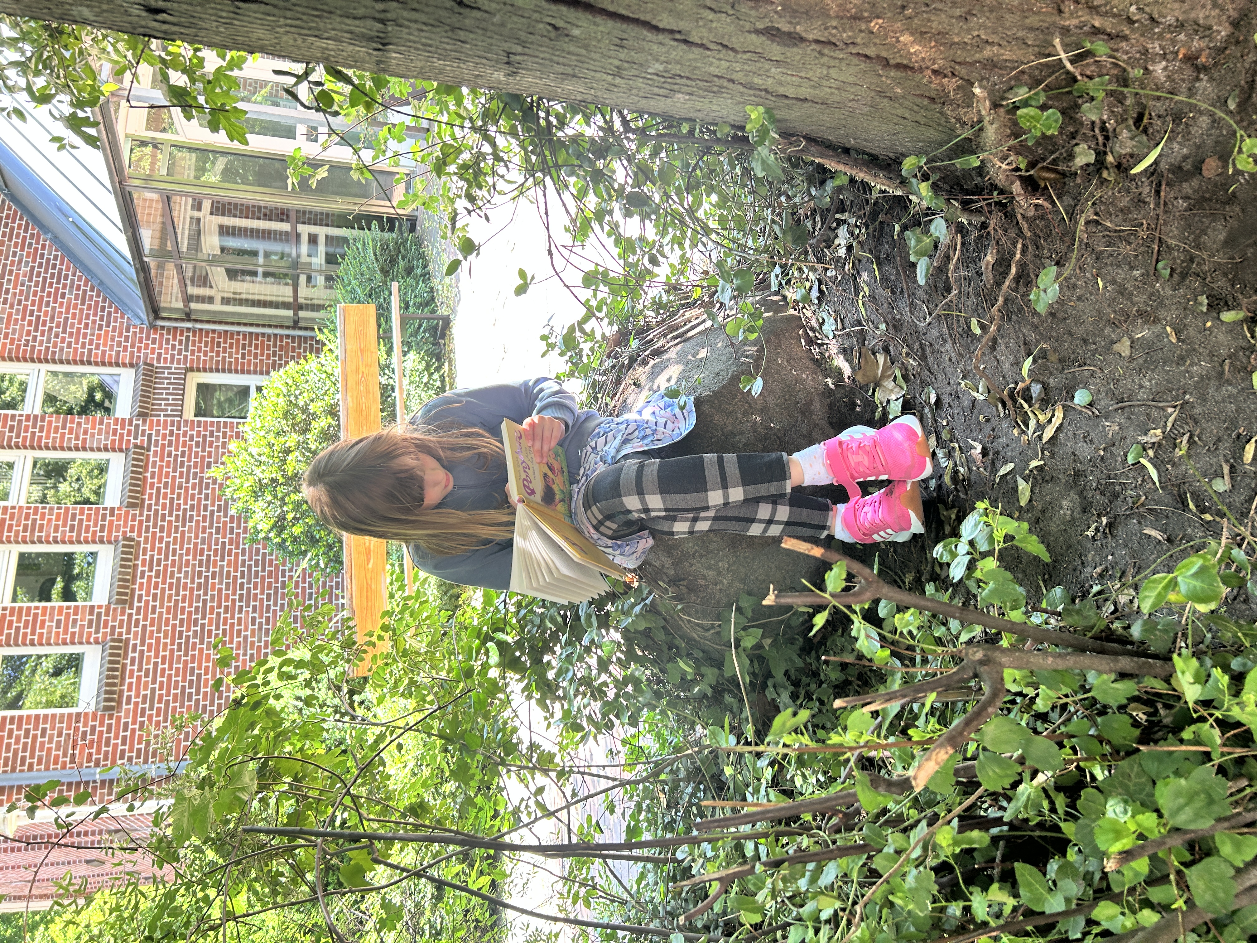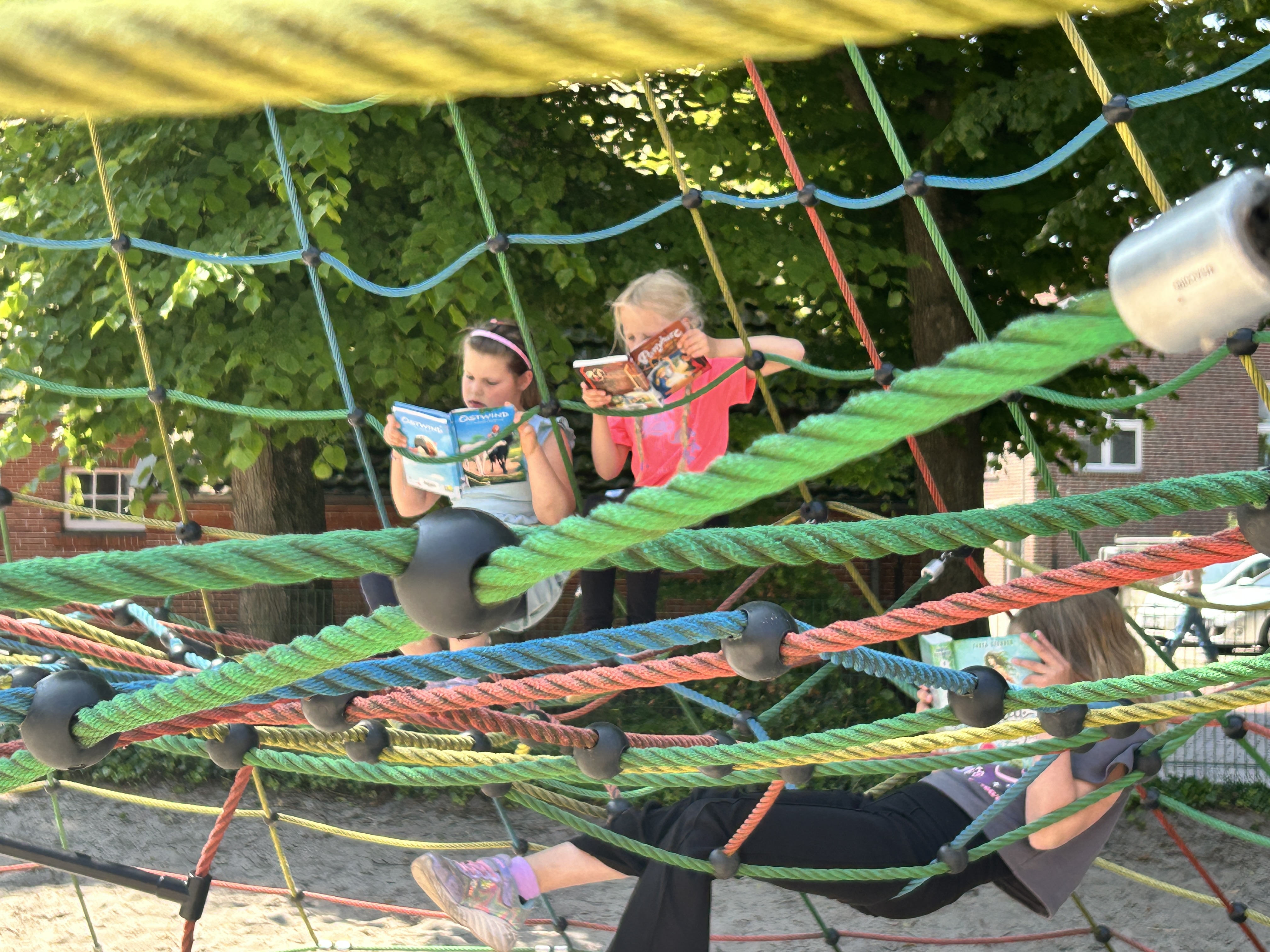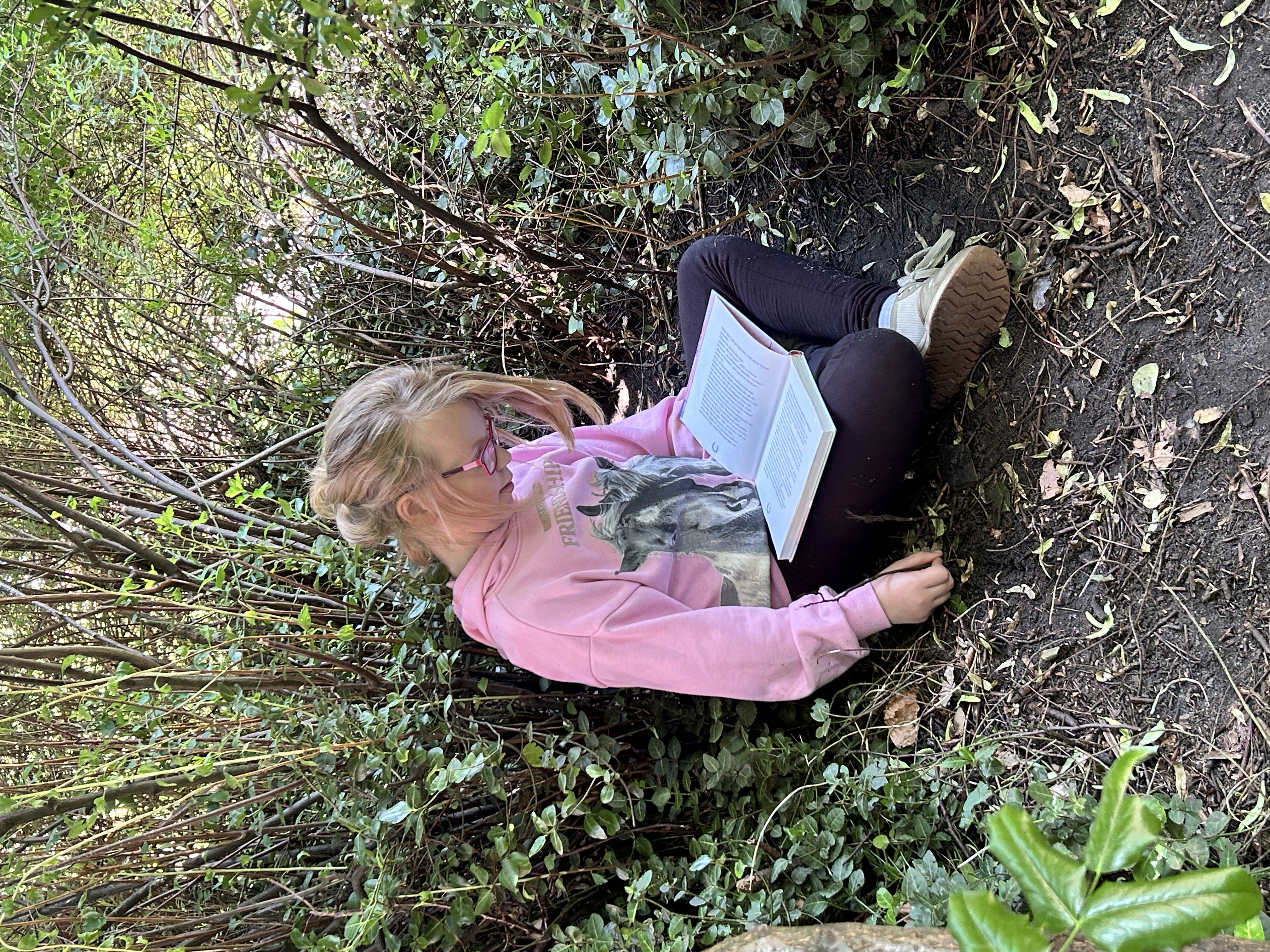 Heute fand unsere Lesezeit mal draußen statt. Nach langem Regen scheint nun endlich wieder die Sonne! Jeder von uns hat sich einen schönen Ort auf dem Schulhof gesucht und dort gelesen. Lesen in der Sonne, im Sand, auf der Kletterpyramide, in der Blätterhöhle oder auf dem Spielturm macht Spaß!
