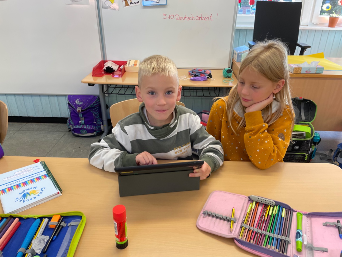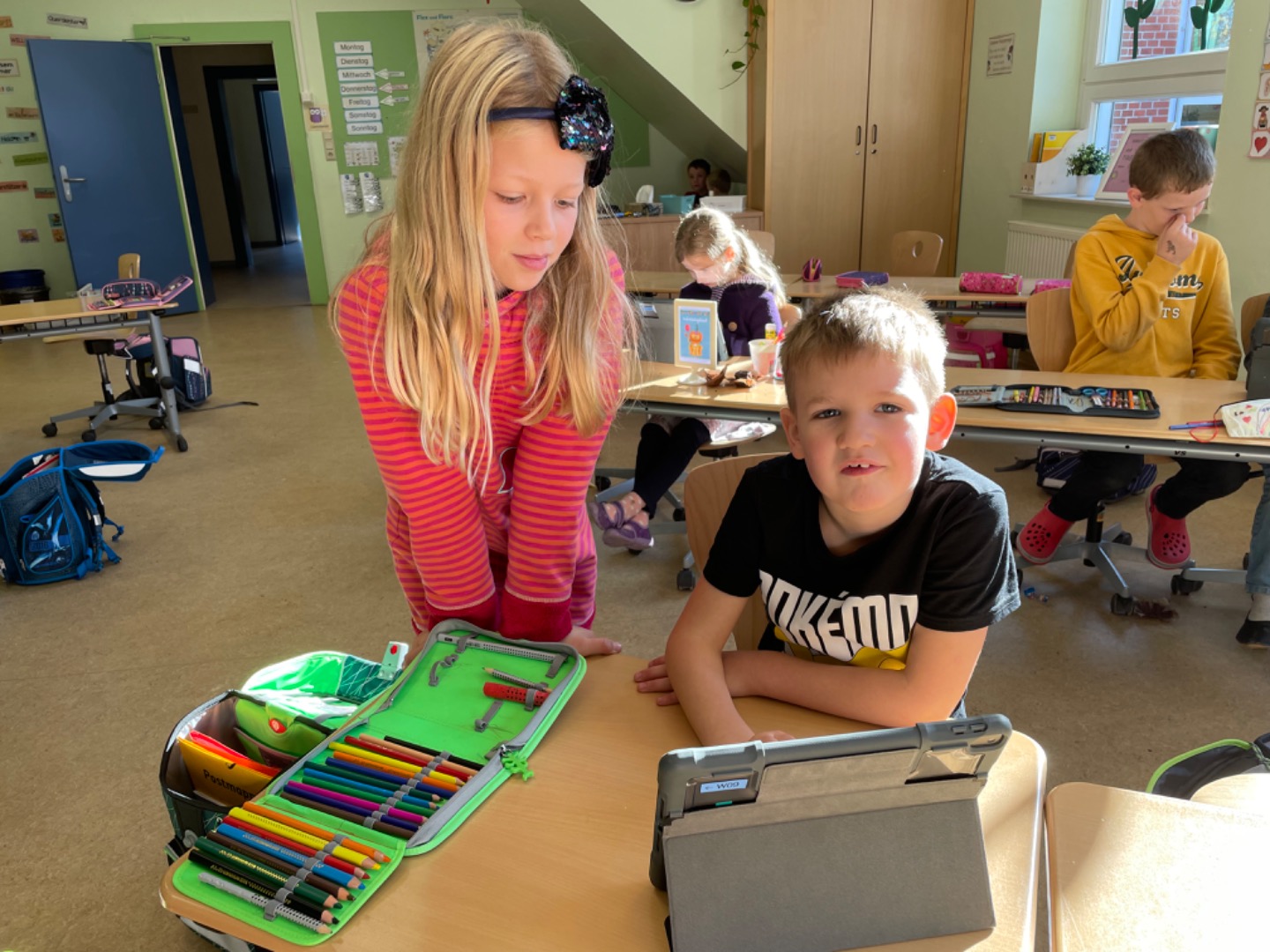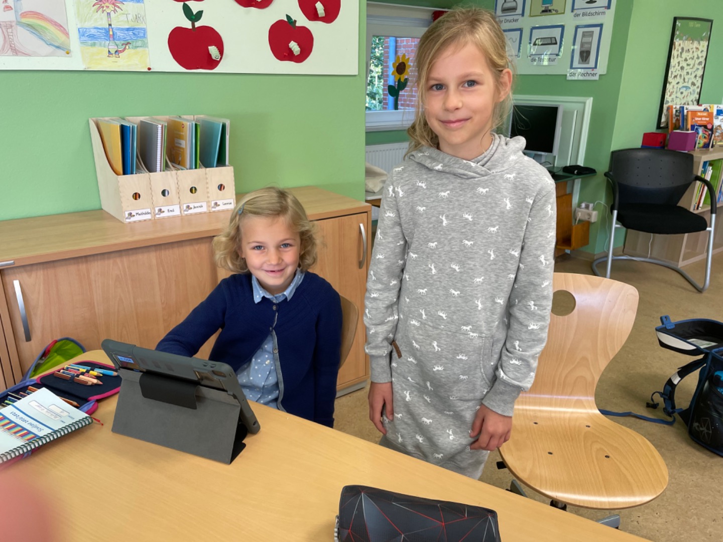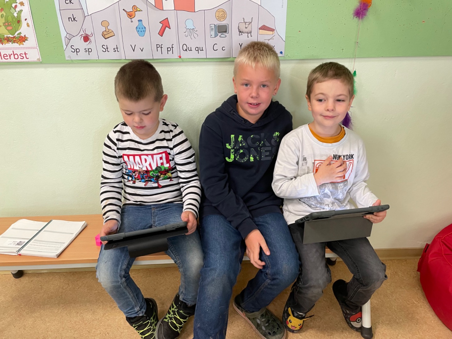 Heute haben wir das erste Mal mit dem Tablet Übungen zum A gemacht. Dabei haben uns unsere Paten geholfen. Das hat viel Spaß gemacht und wird sicherlich wiederholt.