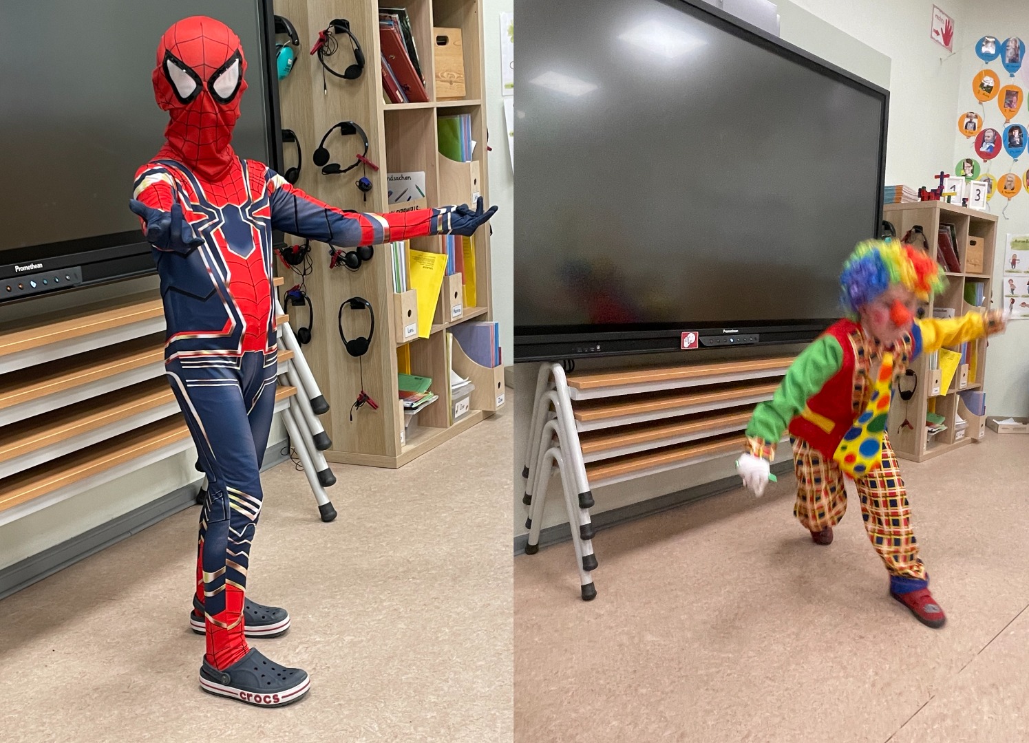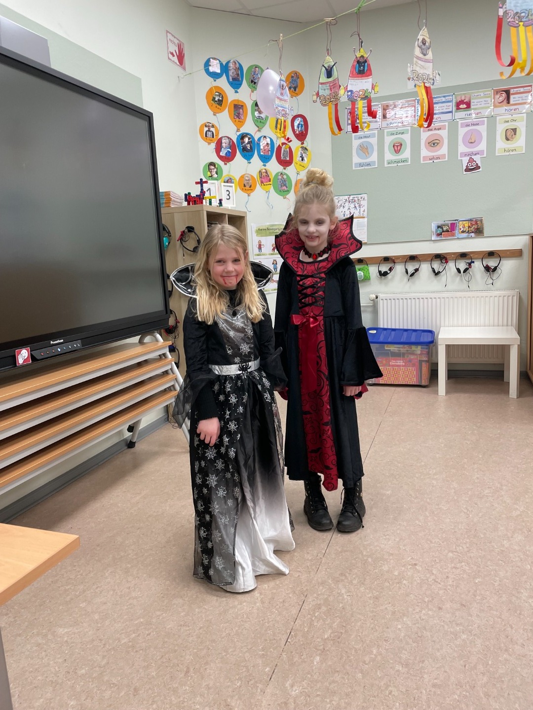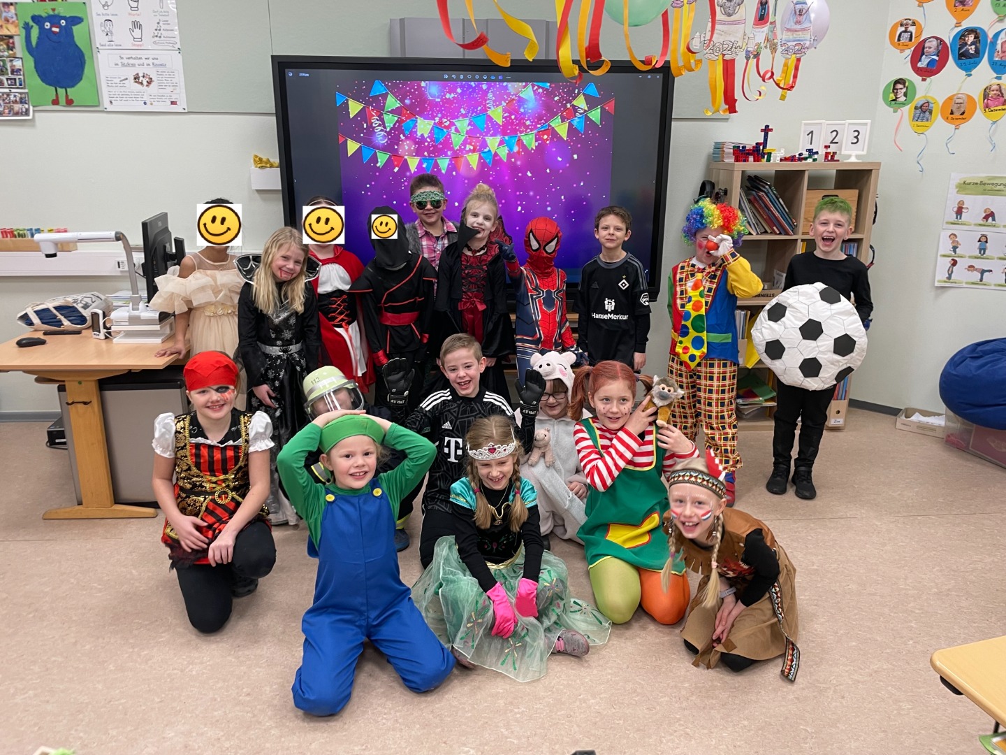 Am Freitag haben wir in der ganzen Schule Karneval gefeiert. Zuerst waren wir zwei Stunden lang in unserer Klasse und haben viel gegessen, Spiele gespielt und Musik gehört. Es durfte auch jedes Kind das eigene Kostüm vorstellen.