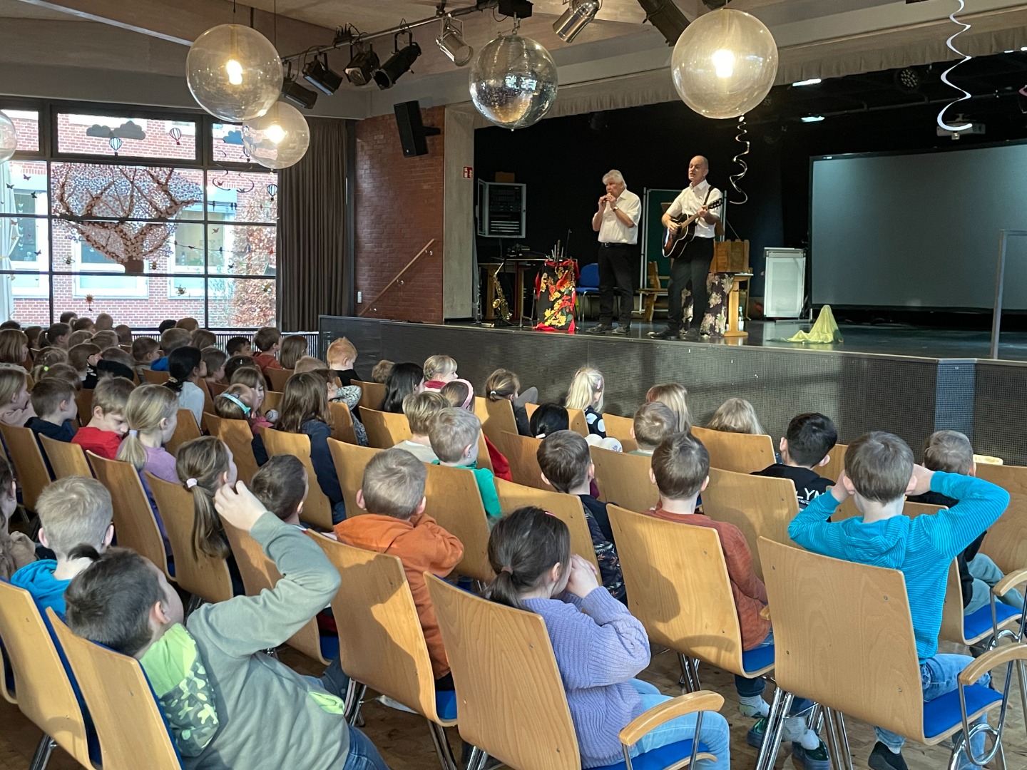 Direkt am Dienstag nach Karneval war dann schon wieder ein besonderer Tag. Wir durften uns in der Aula die Vorstellung \Die Reise der kleinen Blockflöte\ anschauen. Der Musiker konnte richtig viele Instrumente und tolle Lieder spielen. Wir haben kräftig mitgesungen. Es hat uns sehr gut gefallen!