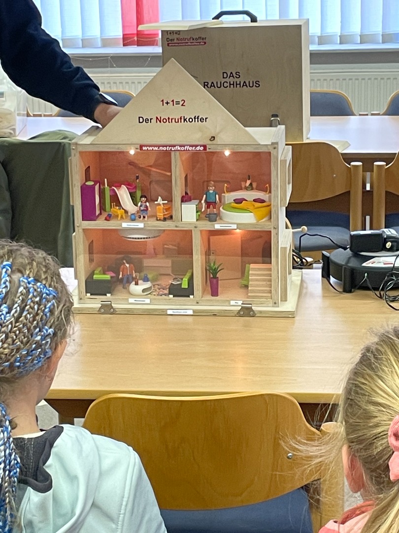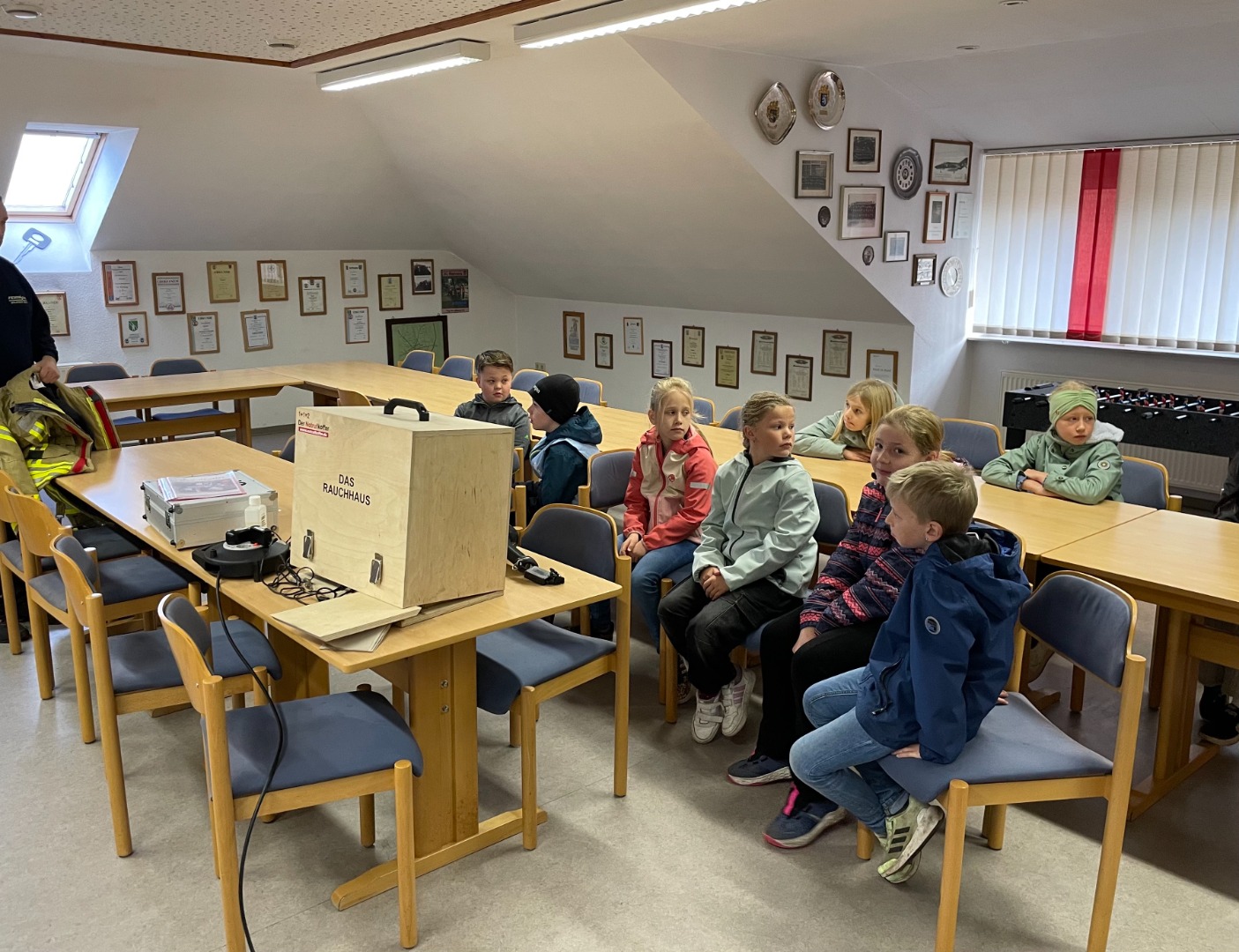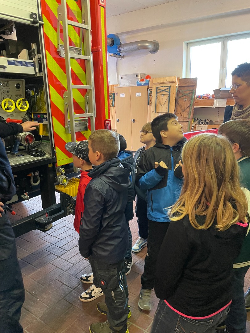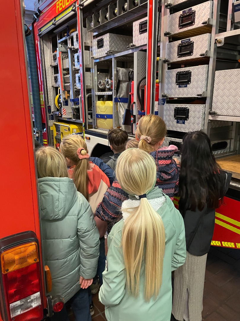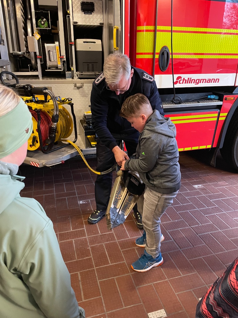 Am Freitag durften wir uns bei der Feuerwehr Uplengen-Mitte in Remels umschauen. Wir haben uns das Einsatzleitfahrzeug sowie das große Feuerwehrauto ganz genau angeschaut und konnten dabei viele neue Dinge lernen. Außerdem haben wir uns anhand eines Modells die Rauchentwicklung in einem Haus angeschaut. Gemeinsam haben wir die wichtigsten Dinge zum Verhalten im Brandfall und bei einem Notruf besprochen.