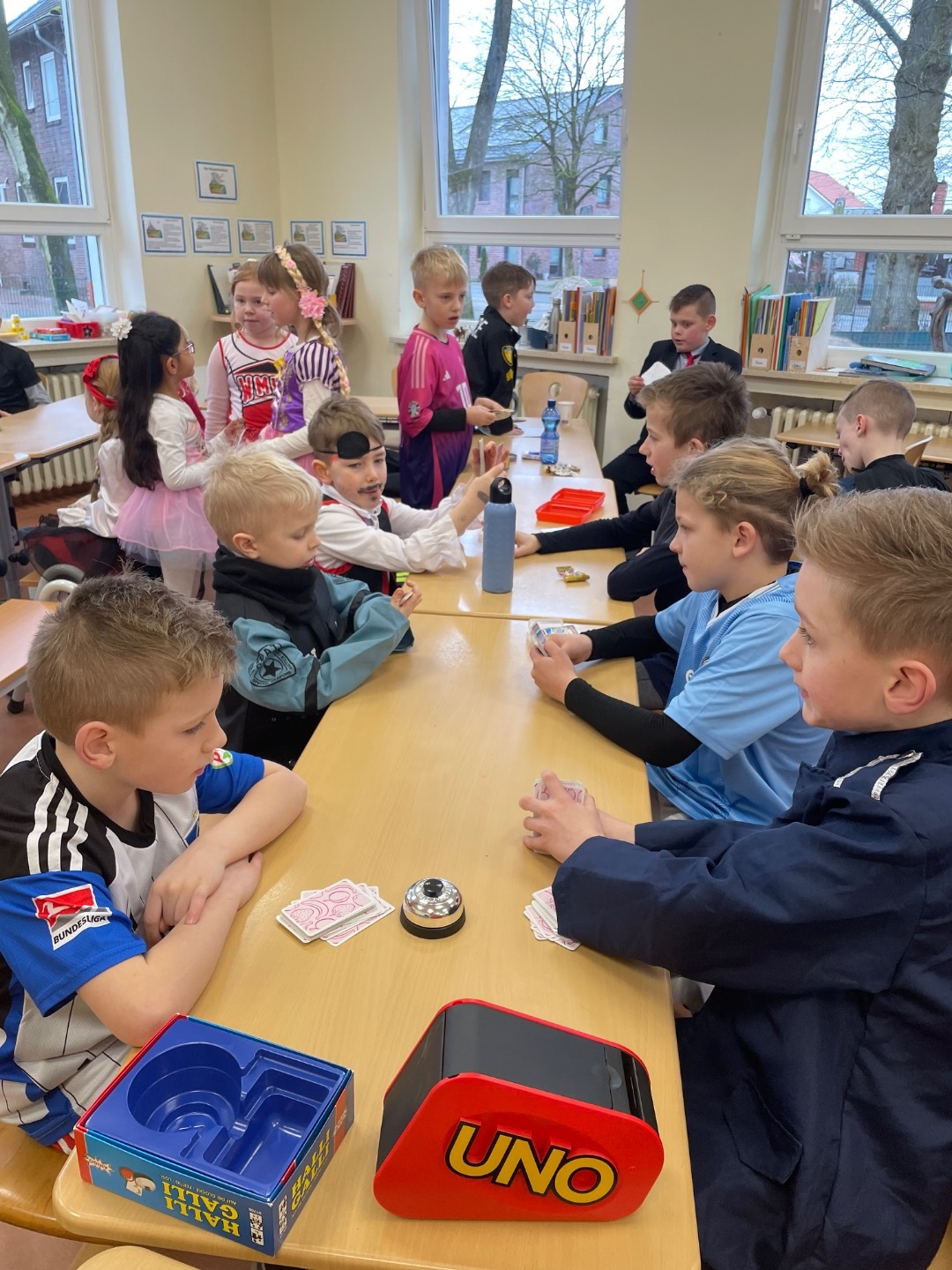Heute war es bunt und laut in der Schule, denn wir haben Karneval gefeiert. Viele tolle und einfallsreiche Kostüme gab es zu bestaunen. In allen Klassen wurde viel gespielt, getanzt und auch das Süßigkeitenbuffet durfte natürlich nicht fehlen. Außerdem wurde eine Polonaise durch die Schule gemacht und auch in den Pausen wurde bei toller Musik getanzt und gelacht. Alle hatten einen tollen Tag.