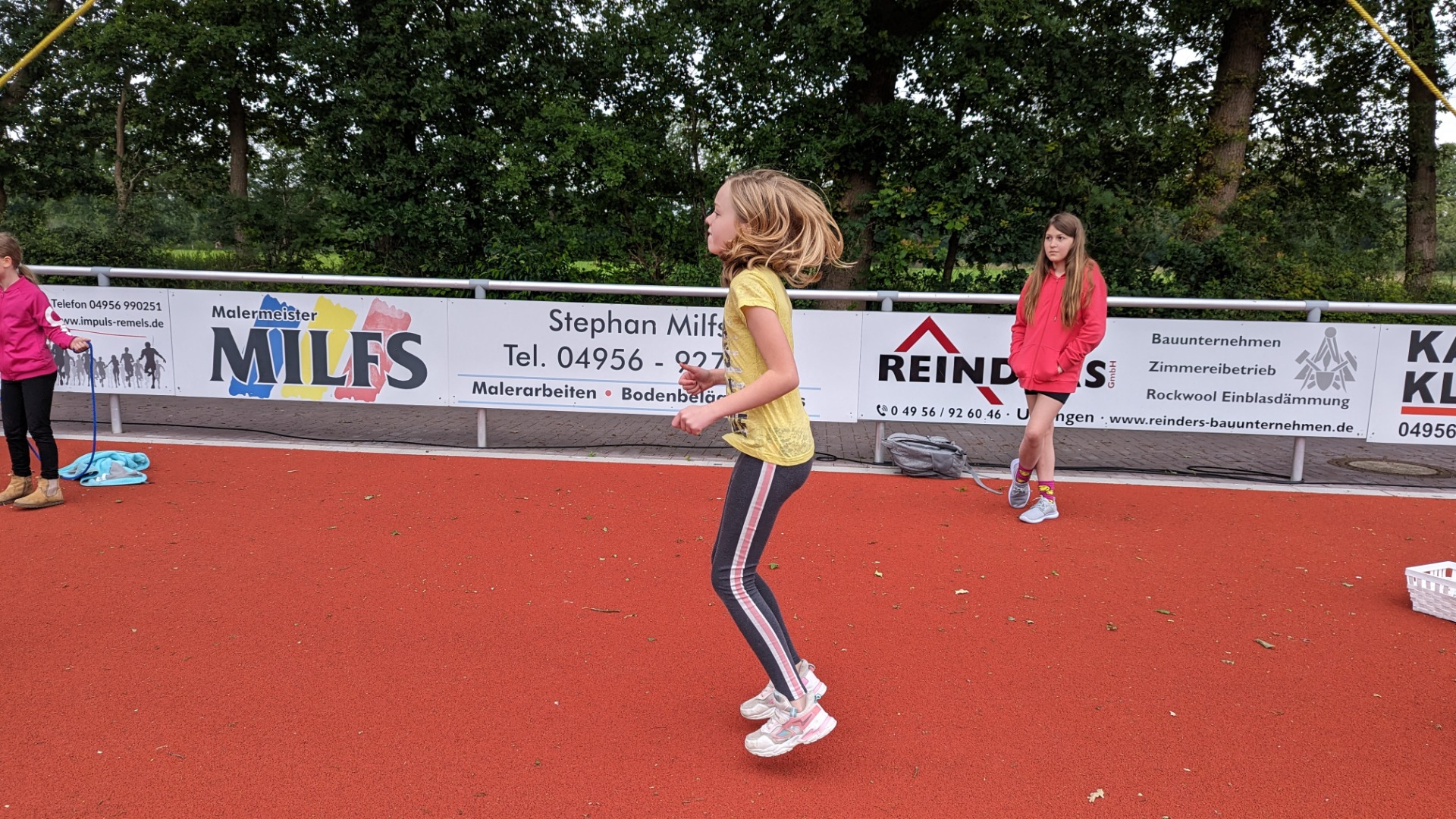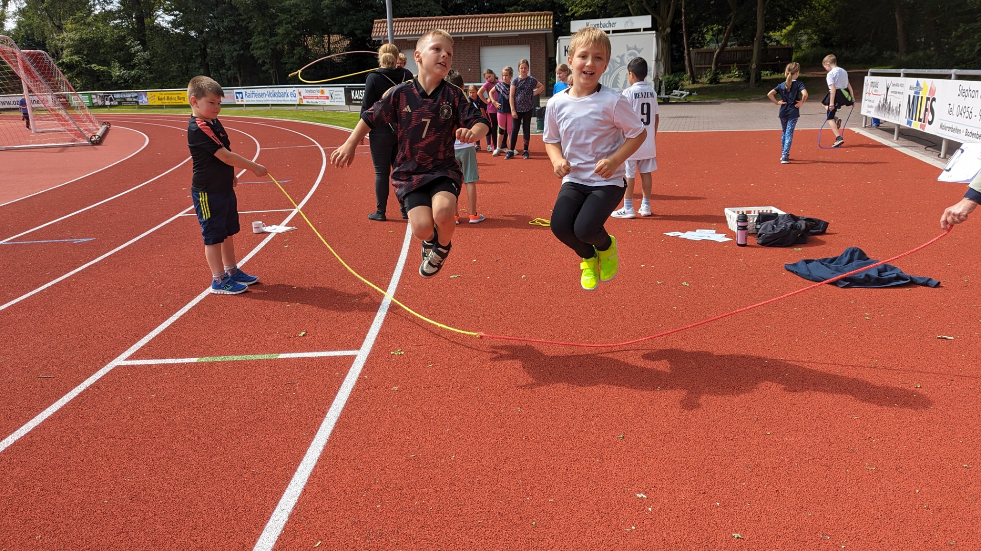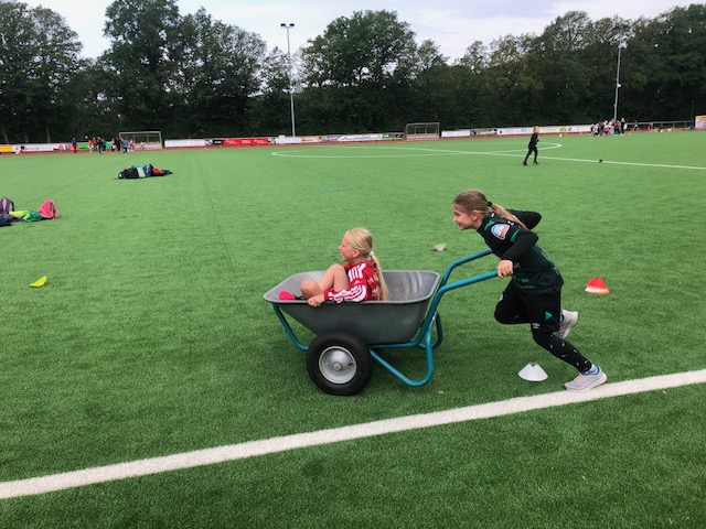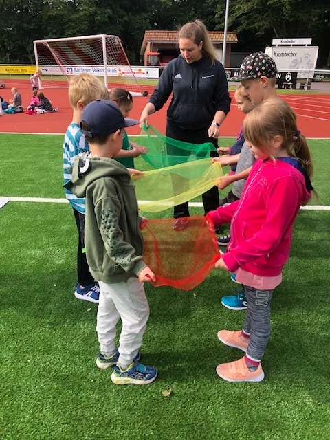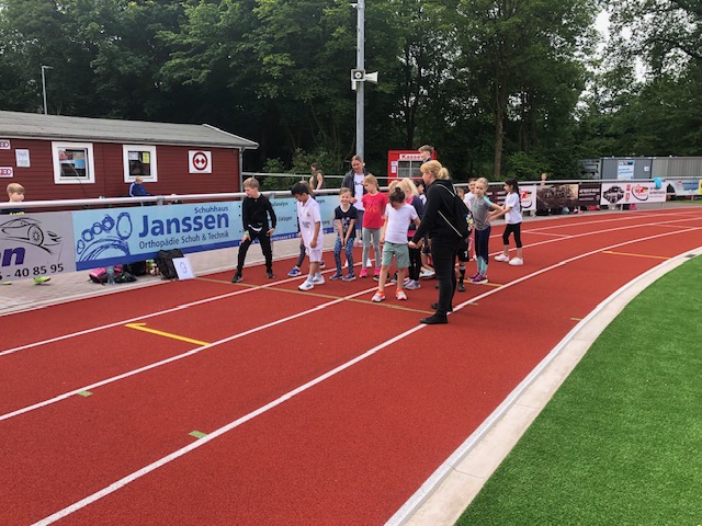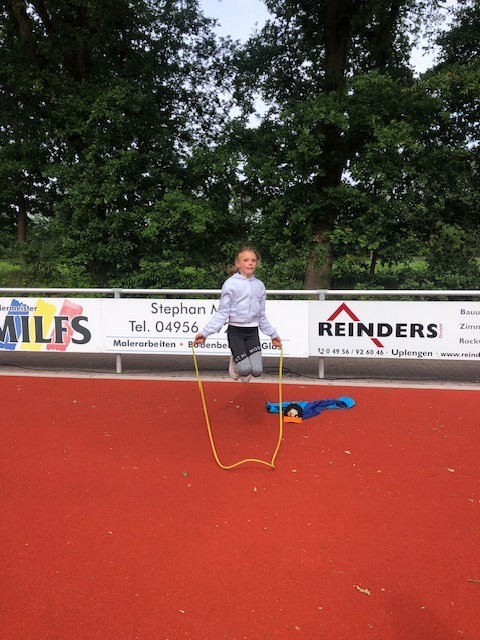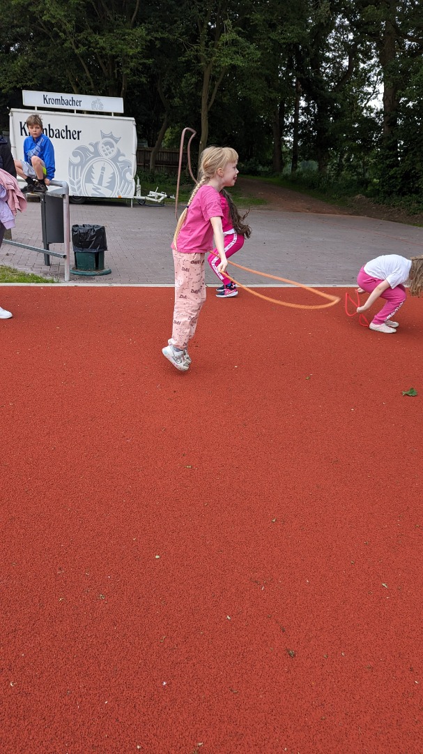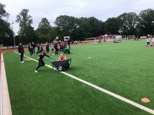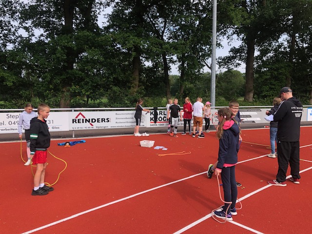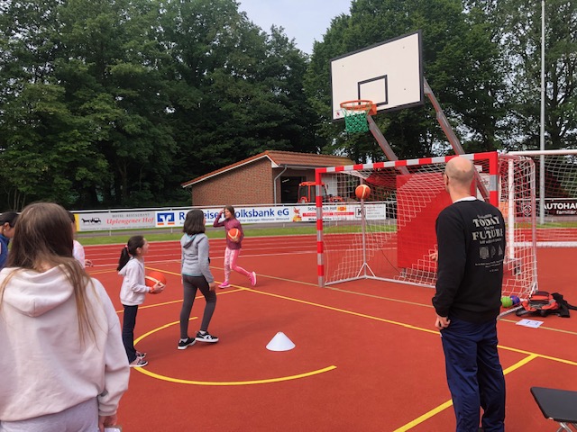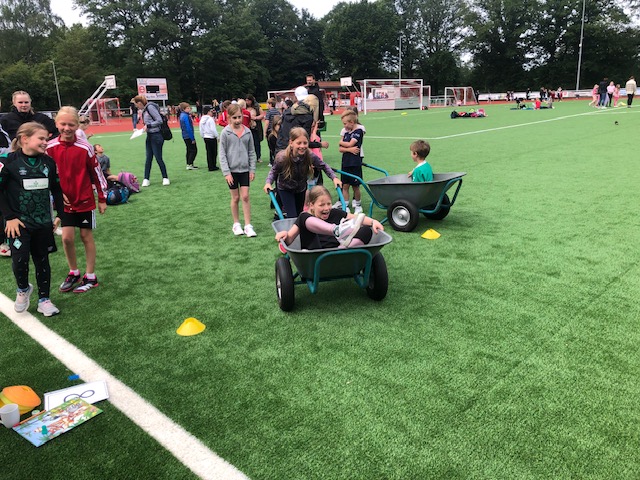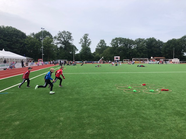 Bei bestem Wetter fand heute das Sportfest der gesamten Grundschule Remels auf dem neuen Sportplatz der Oberschule statt. Um 9 Uhr wurde das Event mit dem Aufwärmlied \'Tanz alles was du hast\' gestartet. Mit ihrer Stempelkarte sind die Kinder als Füchse, Igel, Wale, Hirsche, etc. in Kleingruppen gemeinsam mit einer Begleitperson die verschiedenen Stationen abgelaufen. Insgesamt gab es 16 verschiedene Stationen. Von Sprinten, Zielwerfen, Hangeln, Basketball, Seilhüpfen, Hindernislauf bis Schubkarrenrennen, Tic Tac Toe, Trampolinspringen, Memory-Lauf und Reifenweitergabe war alles dabei. An jeder erfolgreich beendeten Station gab es einen Stempel auf der Stempelkarte. Alle hatten riesigen Spaß. Unterstützung bekamen wir von den Schülerinnen und Schülern der 7. Klasse der OBS. Der Förderverein versorgte alle Sportlerinnen und Sportler mit Getränken, Obst und Brötchen. Vielen lieben Dank an alle fleißigen Helferinnen und Helfer! Das war ein super gelungenes Sportfest für alle Beteiligten!