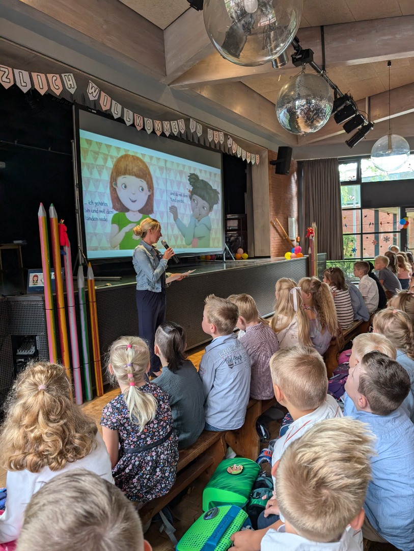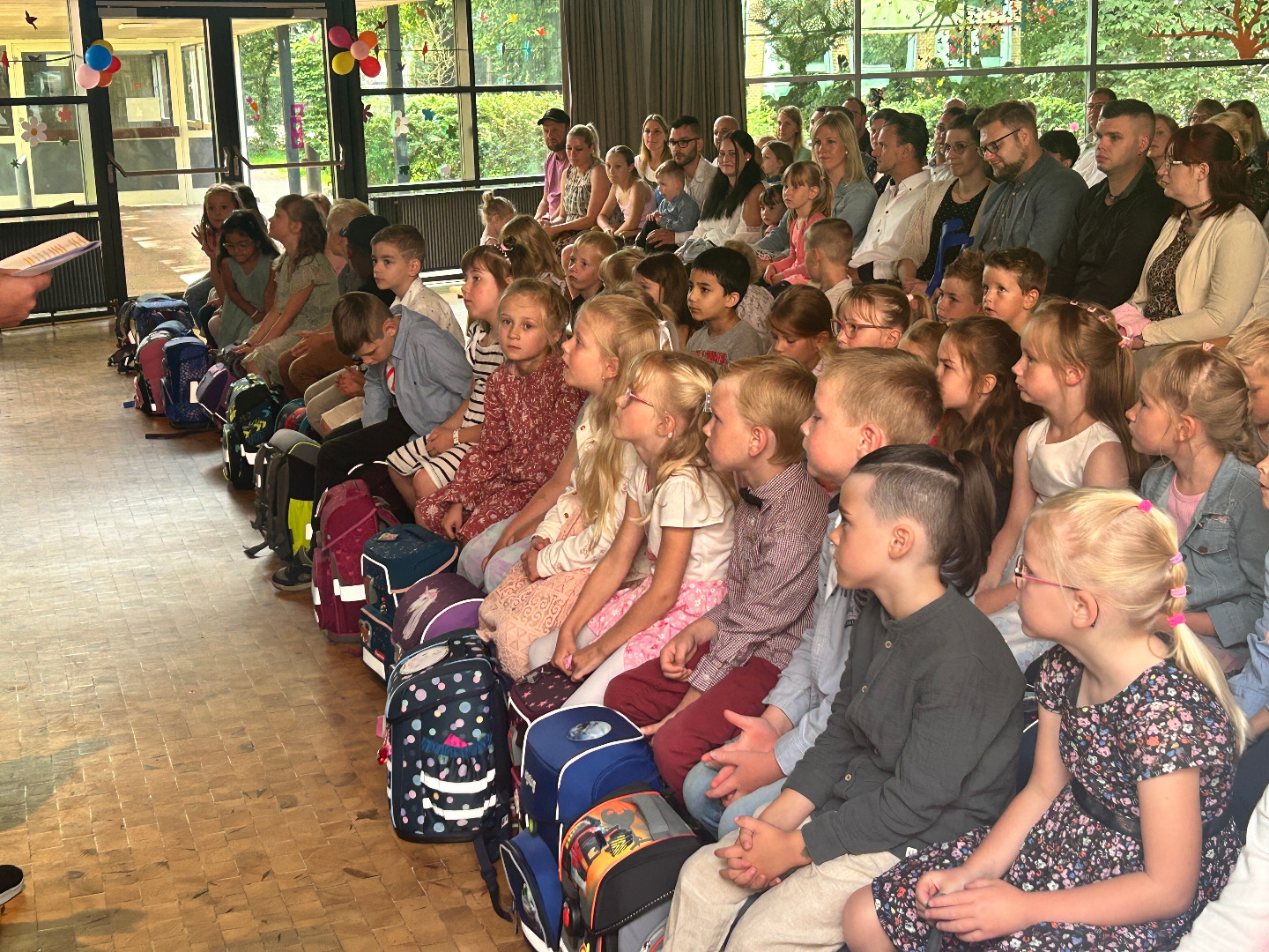 Nach dem Gottesdienst trafen sich alle in der Aula. Die Einschulung stand in diesem Jahr unter dem Motto "Ich bin anders als du - ich bin genauso wie du".