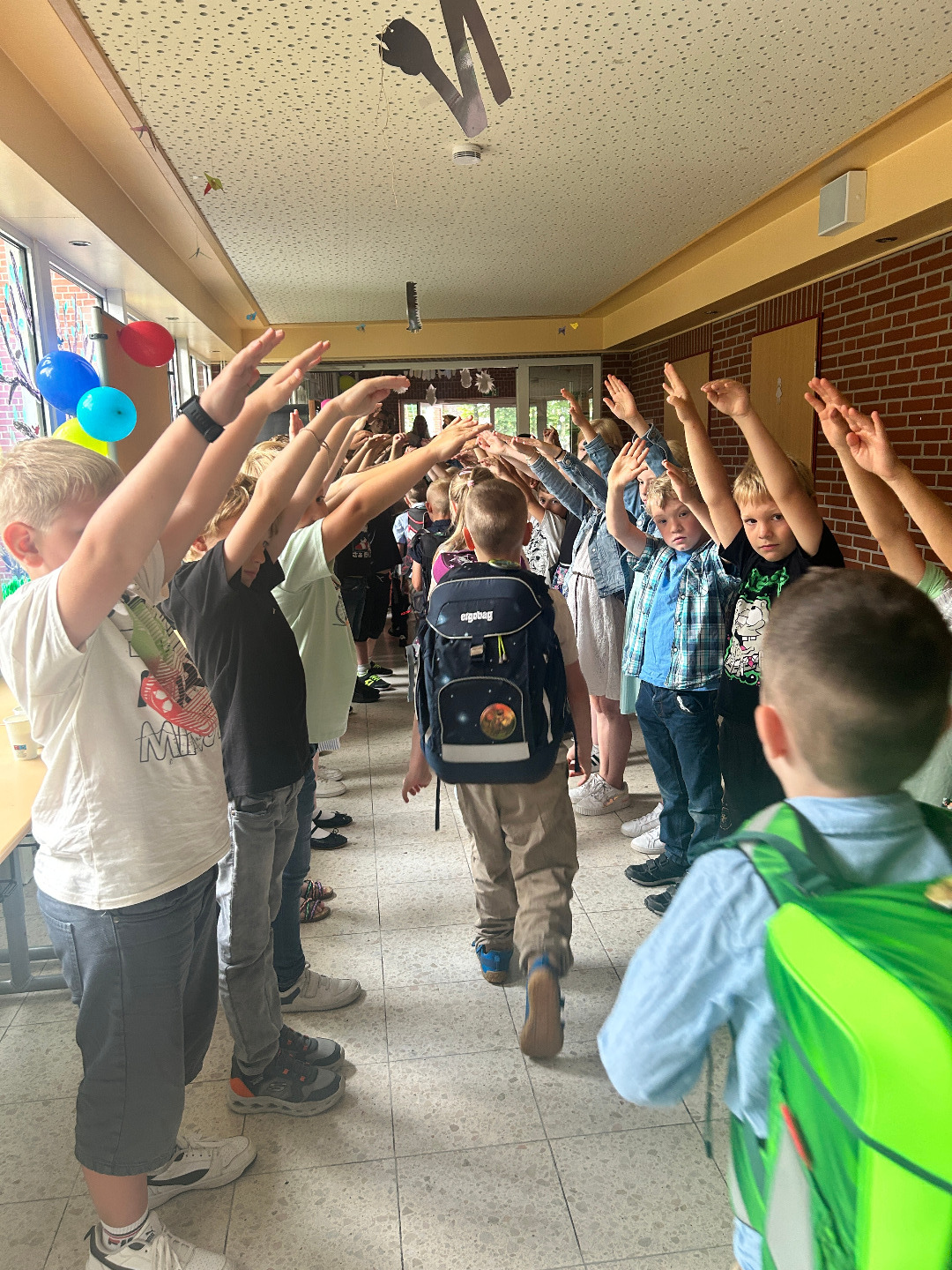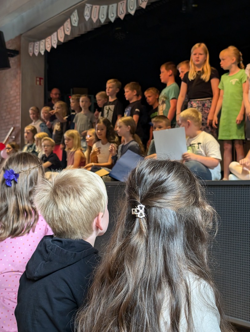 Besonders schön war auch, dass unsere Paten auf der Bühne ein Lied gesungen und uns beim Auszug aus der Aula zum Klassenraum begleitet haben. Dann kam unsere erste Stunde bei den Klassenlehrerinnen. Alle waren ein bisschen aufgeregt, aber es war sehr schön! Später ging es auf den Schulhof, wo unsere Eltern, Großeltern und Freunde schon bei bestem Wetter auf uns warteten.