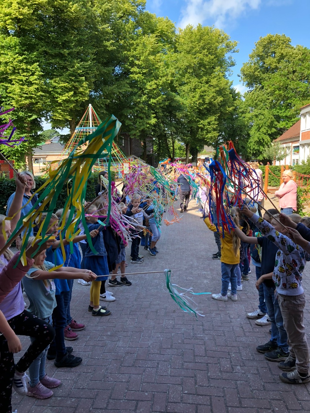 Unter dem Gesang der Schulgemeinschaft: \'Wir sagen euch tschüss und winken dabei und hoffen, dass ihr mal an uns denkt\', wurden am 05.07.2023 die Viertklässler in die verdienten Sommerferien verabschiedet. Man konnte viele grinsende Gesichter beobachten, die unter den bunten flatternden Fahnen der winkenden Grundschülerinnen und Grundschüler hindurchgingen. Aber es waren auch bewegende Momente dabei, wo das ein oder andere Tränchen verdrückt werden musste. Ein hochemotionaler letzter Schultag, mit vielen Geschenken, schönen Worten, herzlichen Umarmungen und strahlenden Augen endete mit dem Gang durch das Spalier. Das Abenteuer Grundschule geht zu Ende und wir werden garantiert noch oft an die vielen wunderbaren Momente mit den Schulabgängern zurückdenken. Das Abenteuer Grundschule ist für euch nun zu Ende und es erwartet euch eine neue spannende Zeit, die wieder neue Herausforderungen und unvergessliche Ereignisse für euch bereit halten wird. <\/p>\r\n
